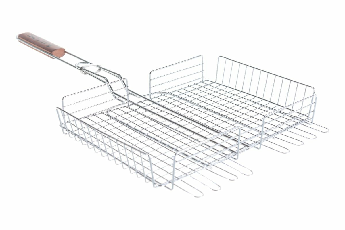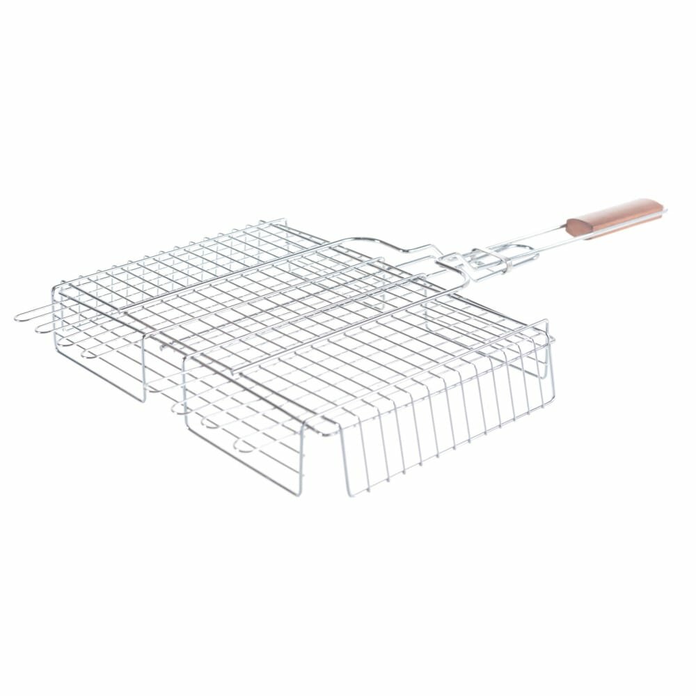 Глубокая и регулируемая по высоте решетка для барбекю поможет легко приготовить вкуснейшие блюда на открытом огне. Удобная деревянная ручка не нагревается при использовании и не скользит в руках. Благодаря тому, что решетка переворачивает все содержимое одним движением, значительно экономится время при готовке. Удобный зажим прочно закрепит продукты на решетке, будь то мясо, овощи или рыба. Используется для приготовления блюд на мангале и открытом огне. Материал: хромированная сталь; Материал ручки: дерево; Общая длина: 67 см; Размер решетки: 35 x 25 x 6 см.