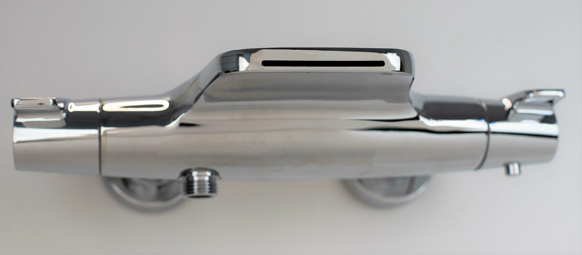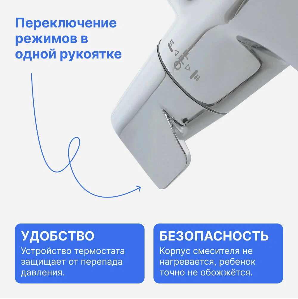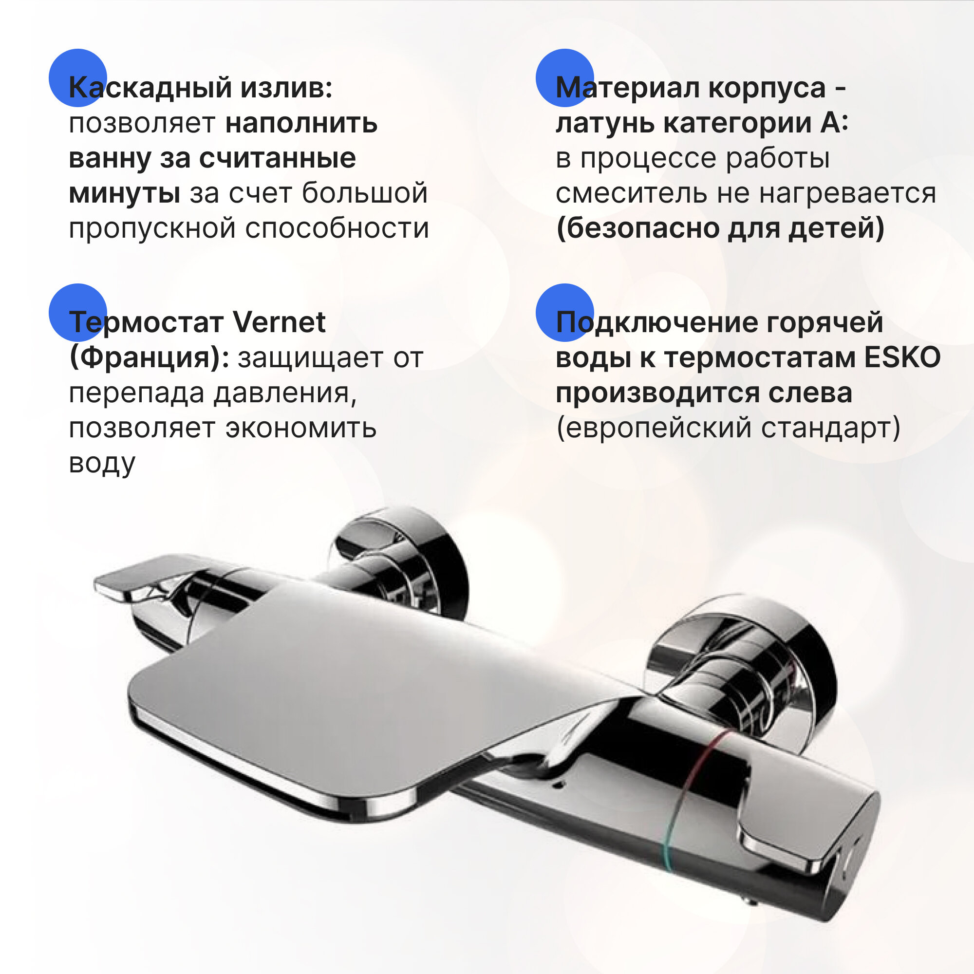 Термостат - каскад с направленным потоком воды. Термоэлемент(Италия), скорость контроля температуры менее 1 сек. Удобные ручки сконструированы таким образом, чтобы избежать проскальзывания при мыльных руках. Форма смесителя запатентована компанией Мастерпол. Корпус смесителя можно использовать как полочка для душевых аксессуаров. Материал сентехническая латунь кат. А. Встроенный аквадиммер. Плавный ход ручки.