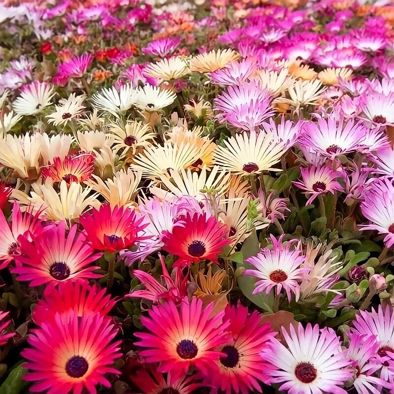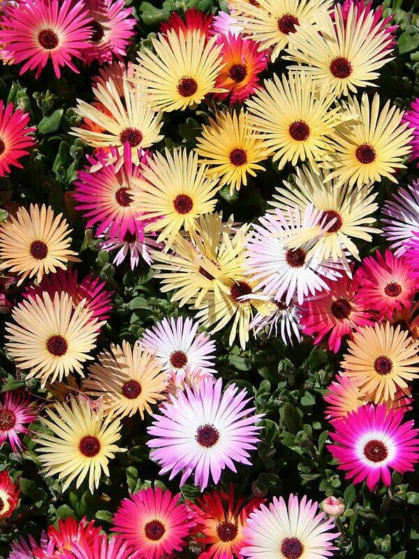 Палитра ярких играющих красок. Стелющееся растение с толстыми мясистыми желто-белыми листьями и стеблями. Отличается сильным ростом, образует ползучие побеги. Крупные цветки, диаметром 4-5 см. В пасмурные дни цветки закрываются, но при солнечной погоде вспыхивают ярким, сверкающим ковром. Используют для рокариев, бордюров, каменистых горок и как горшечная культура. Цветет всё лето, с июня до октября.