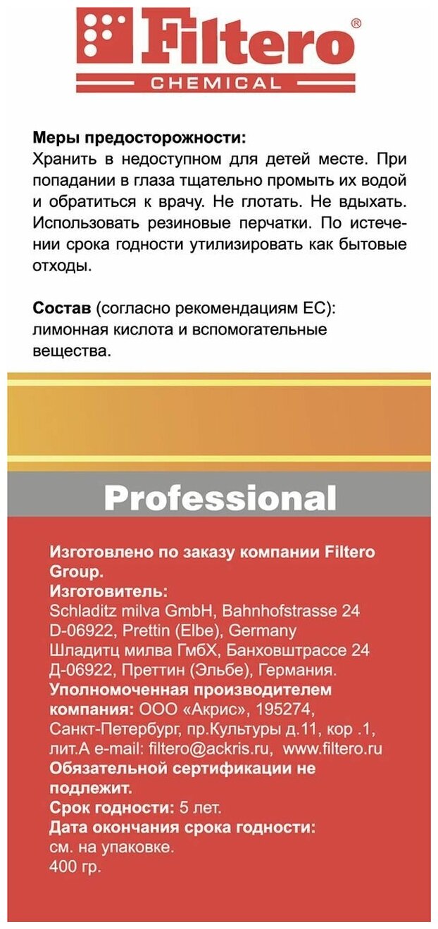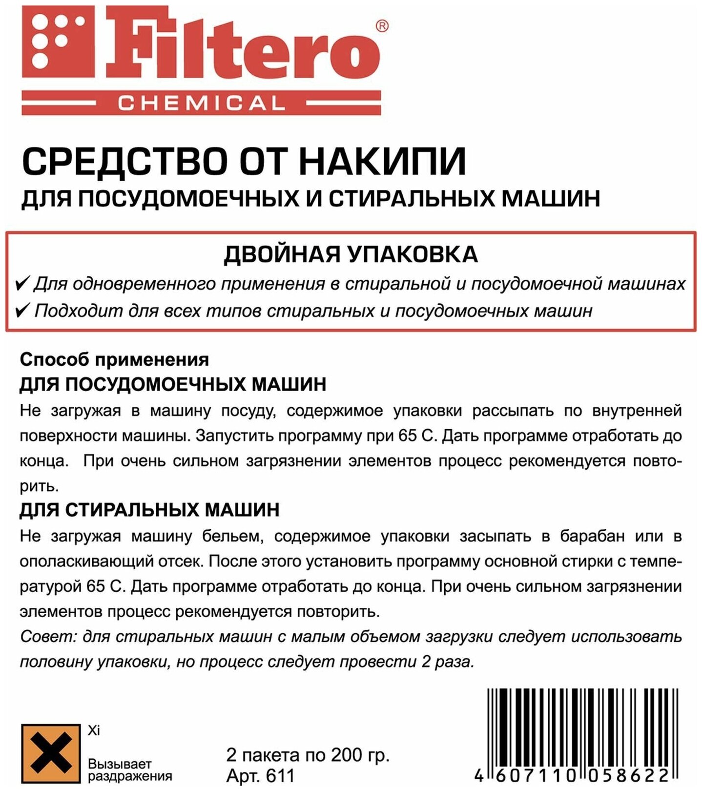 Интенсивное очищение от накипи за одно применение. Для стиральных и посудомоечных машин. Специальное средство для чистки и ухода за посудомоечной и стиральной машиной. Идеально удаляет устойчивые отложения накипи на греющих элементах машины. Средство Filtero гарантирует оптимальную работу бытовой техники и уменьшает потребление электроэнергии. Рекомендуется для интенсивной очистки 2-3 раза в год. Двойная упаковка. Для одновременного применения в стиральной и посудомоечной машинах. Подходит для всех типов стиральных и посудомоечных машин