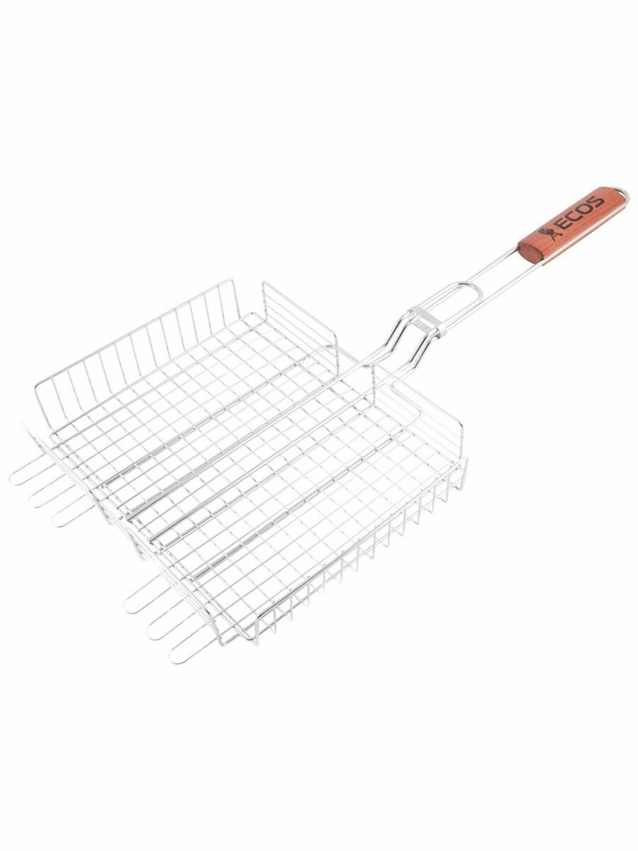 Решетка для барбекю ECOS глубокая, регулируемая глубина, 31х24х5 см, общая длина 65 см/ Глубокая и регулируемая по высоте решетка для барбекю поможет легко приготовить вкуснейшие блюда на открытом огне. Удобная деревянная ручка не нагревается при использовании и не скользит в руках. Благодаря тому, что решетка переворачивает все содержимое одним движением, значительно экономится время при готовке. Удобный зажим прочно закрепит продукты на решетке, будь то мясо, овощи или рыба. Легко моется и прослужит долгое время.