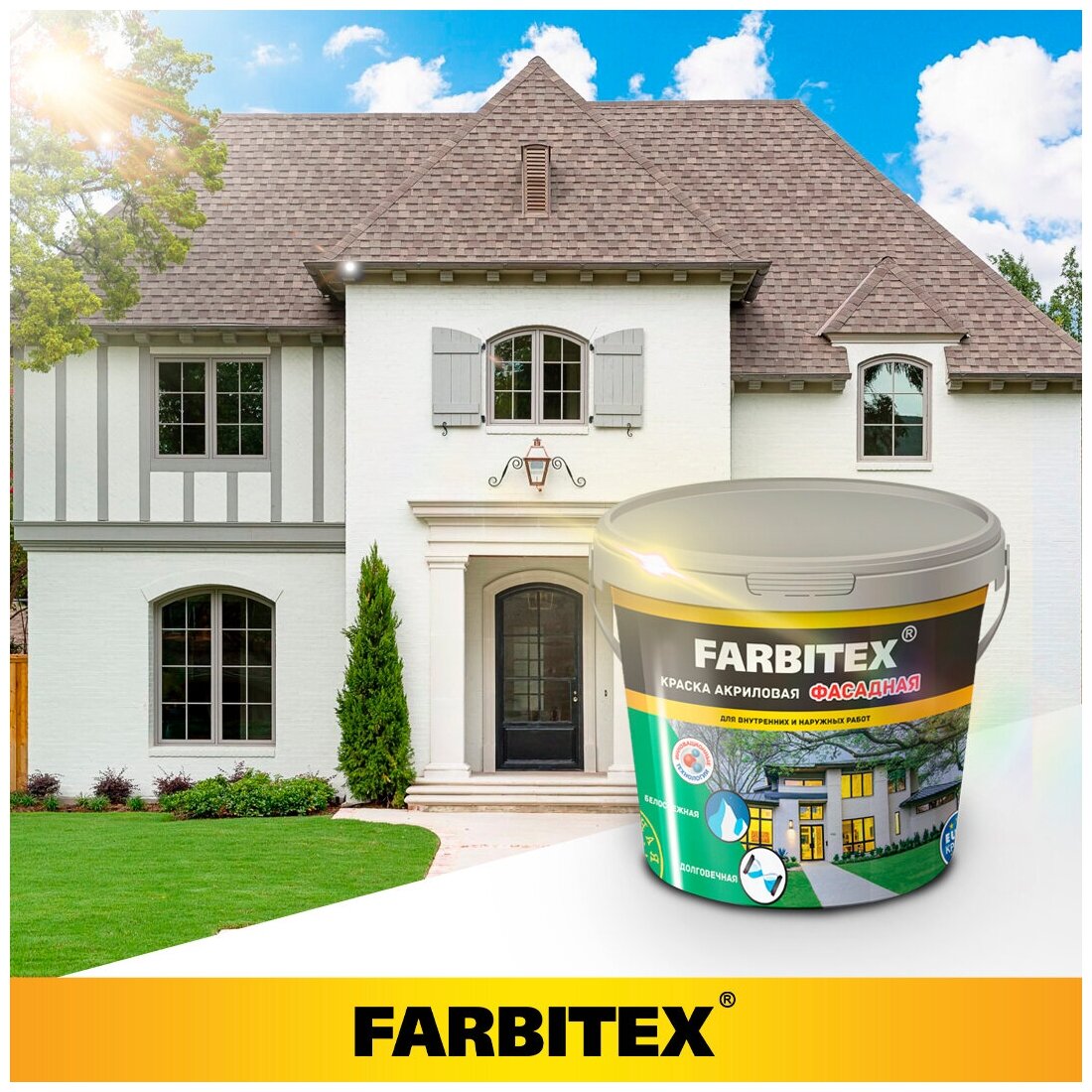 Акриловая водно-дисперсионная фасадная краска FARBITEX для наружных и внутренних работ. Образует паропроницаемое матовое покрытие, устойчивое к атмосферным воздействиям, УФ лучам, перепаду температур, влаге. Отлично выдерживает сильные морозы до -40и знойную жару до +40. Обладает высокими декоративными свойствами, отличной укрывистостью и прочным сцеплением с основанием. Сохраняет цвет в течении всего срока эксплуатации: не выгорает, не желтеет, не мелит.