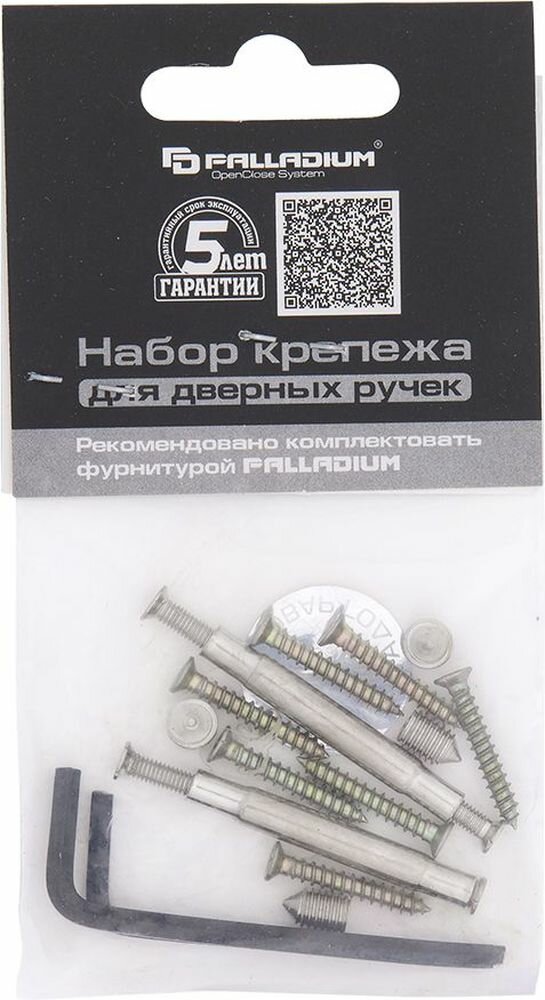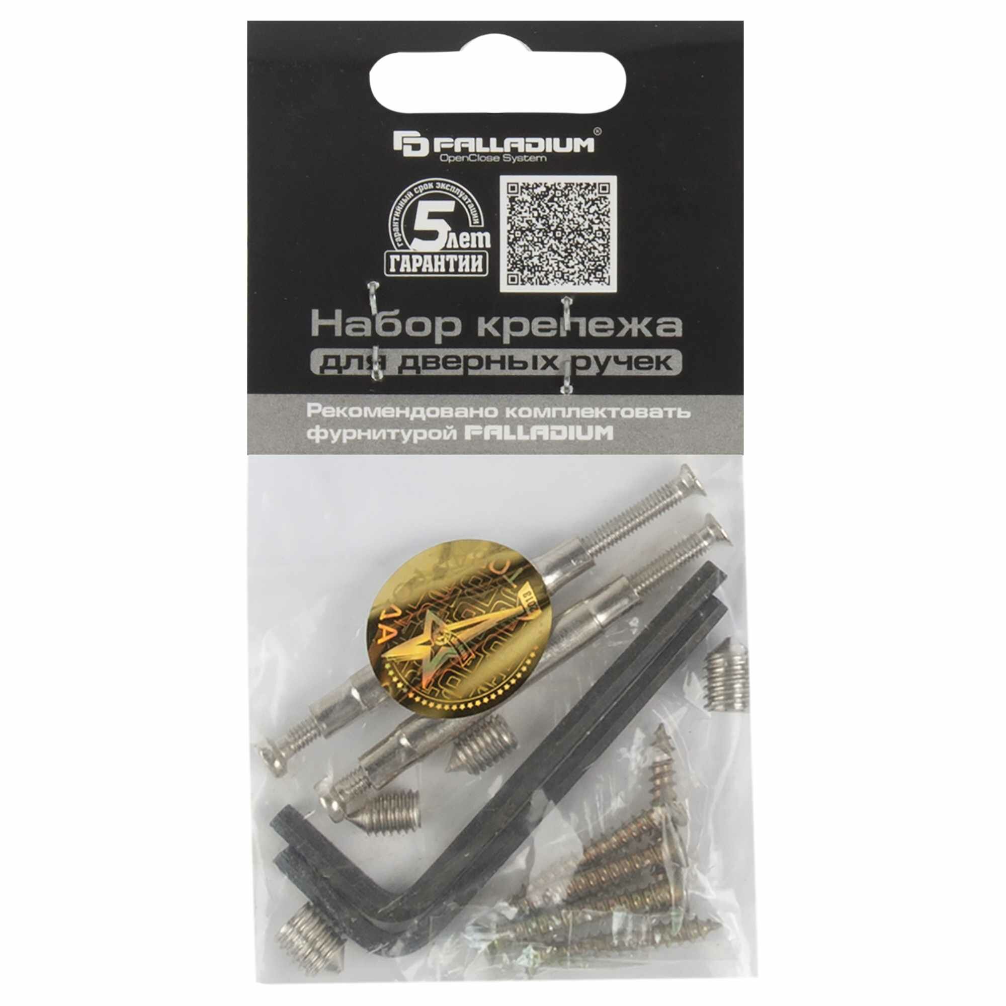 Набор крепежа для дверных ручек универсальный. Подходит для монтажа межкомнатных и входных ручек Palladium коллекций Revolunion и City на двери толщиной от 35 до 50 мм в состав комплекта входят: стяжнее винты - 2 шт. саморезы - 6 шт. ,фиксирующие винты - 2 шт., шестигранный ключ - 2 шт.