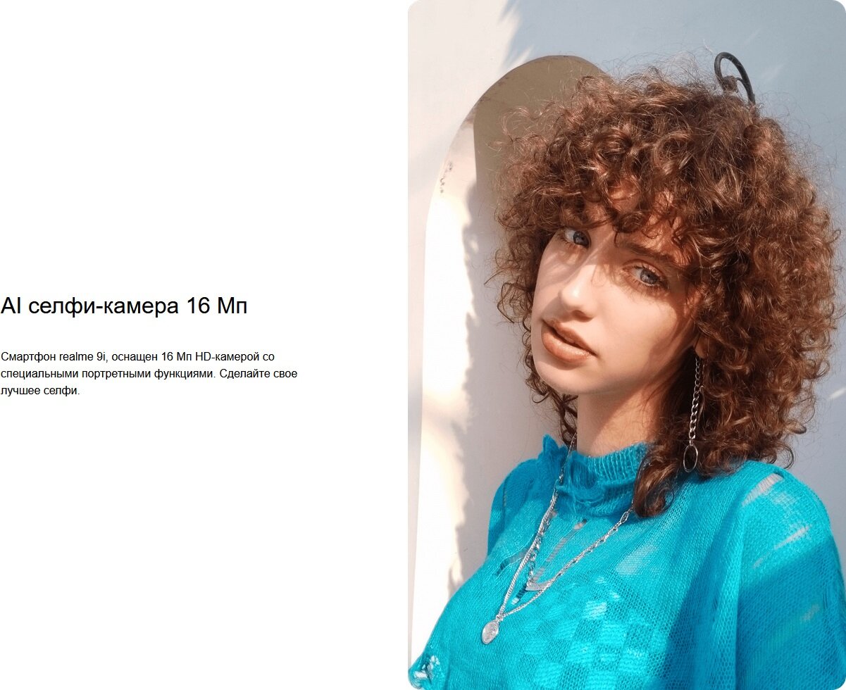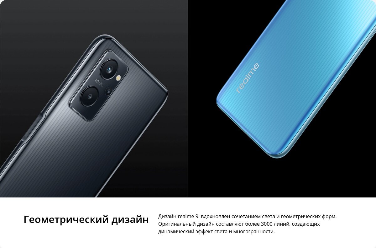 Realme 9i оснащен не только мощными техническими характеристиками, но и завораживающим дизайном. Корпус из стекла и пластика создает ощущение прочности и элегантности одновременно. Благодаря сканеру отпечатка пальца на боковой грани устройства, ваш телефон всегда будет защищен от посторонних глаз.