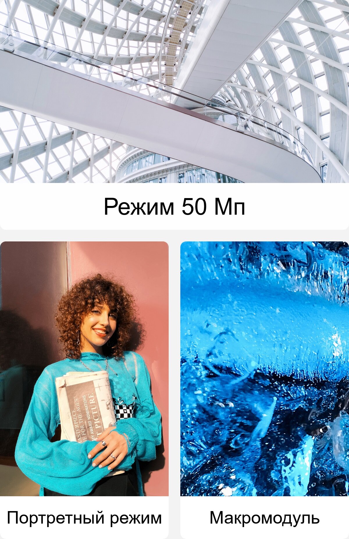 Тройная основная камера, с модулями разрешением 50+2+2 мегапикселя, захватывает фото- и видеоматериалы профессионального уровня, воспроизводя каждую деталь с невероятной четкостью.