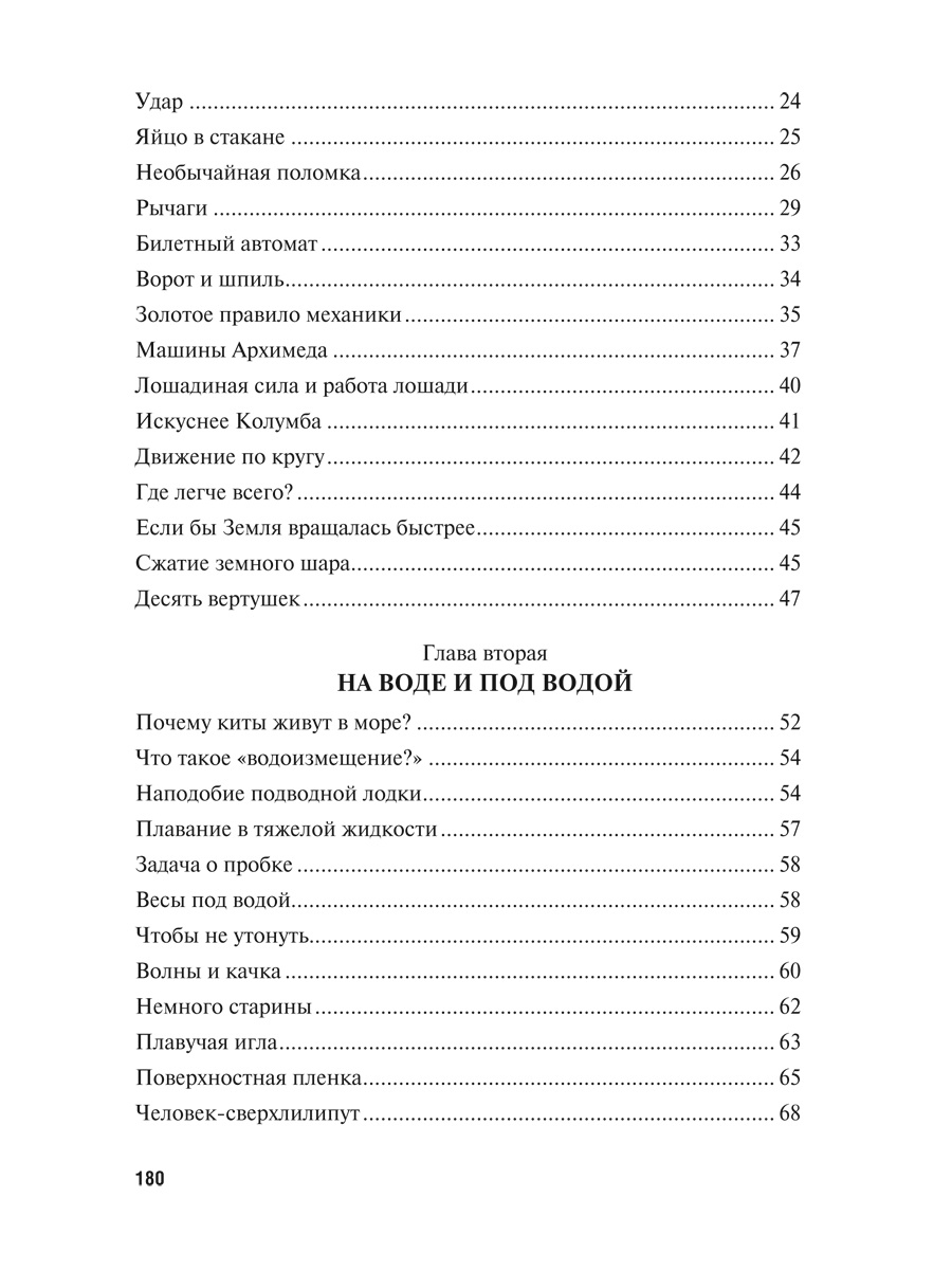 Купила книгу сыну восьми лет для первого знакомства с законами физики. По оглавлению понятны освещаемые разделы. Главы небольшие, где автор живым языком рассказывает исторические факты (иногда), реальную жизненную ситуацию ( как квасить капусту, почему плавают водомерки, как плывёт корабль по волнам, как правильнее вести себя, когда тонешь, чем давление отличается от веса и прочее). Далее простой, интересный опыт, не требующий долгой подготовки, поисков яйца дракона и пера жар-птицы(например, иголка, лежащая на воде) . И немного научной теории, описывающей процесс и формирующей азы знаний. Много иллюстраций. Нам книга очень понравилась, интересная и ребёнку, и взрослому. Единственный минус, тонкая обложка как у журнала и серая тонкая бумага.