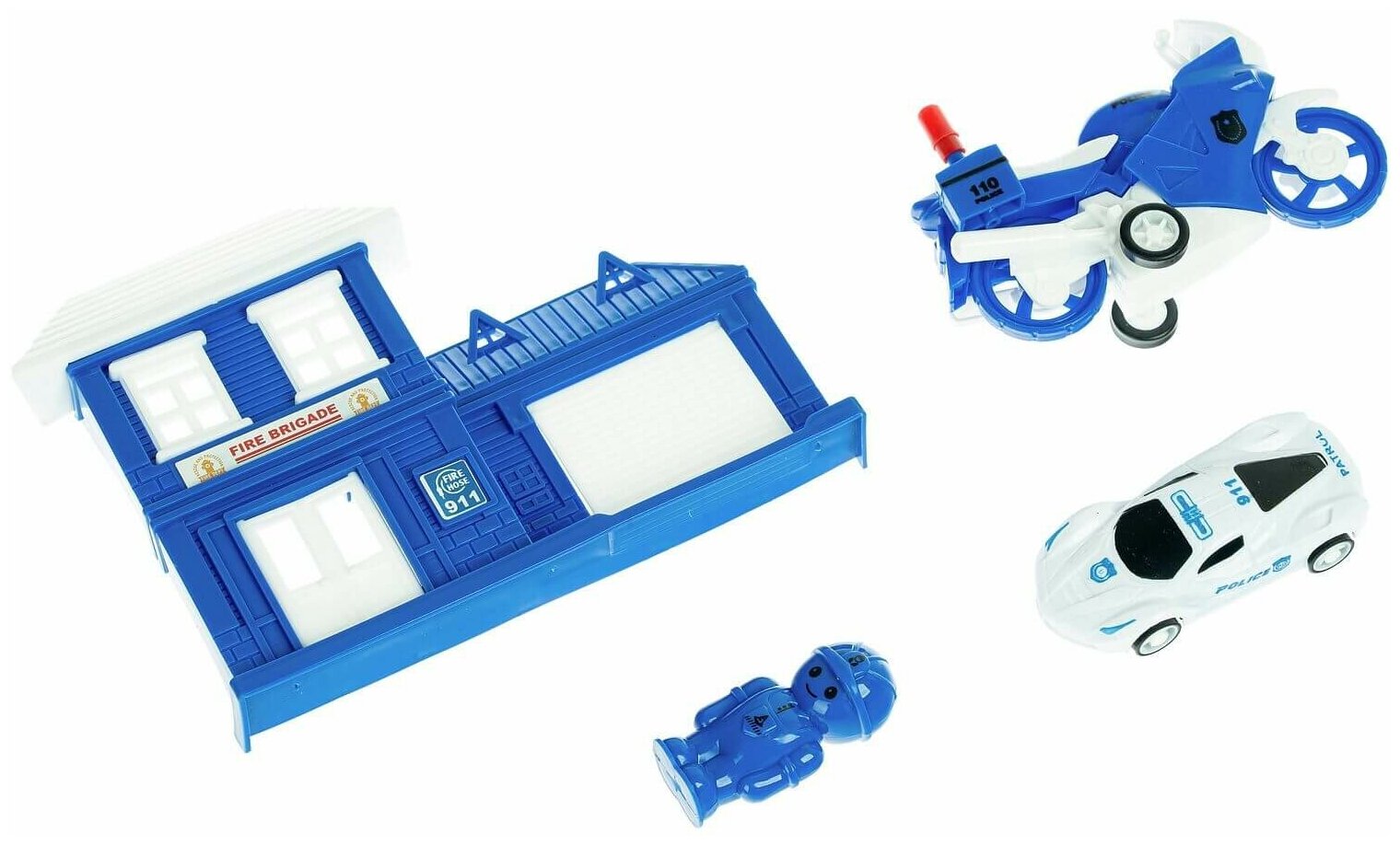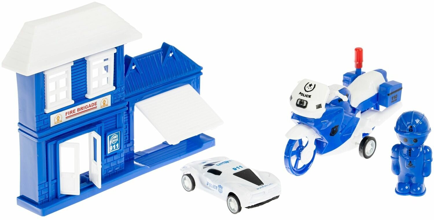 Полицейский участок: двери открываются, ворота поднимаются вверх. Машинка и мотоцикл - инерционные. В состав набора входит фигурка человечка.