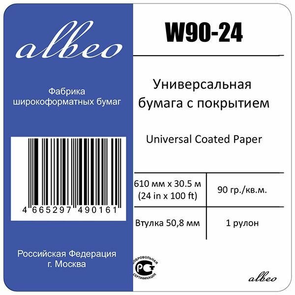 Рулонная бумага для плоттера с покрытием Albeo InkJet Coated Paper-Universal 0.610х30.5 м., 90 г/кв.м (W90-24)