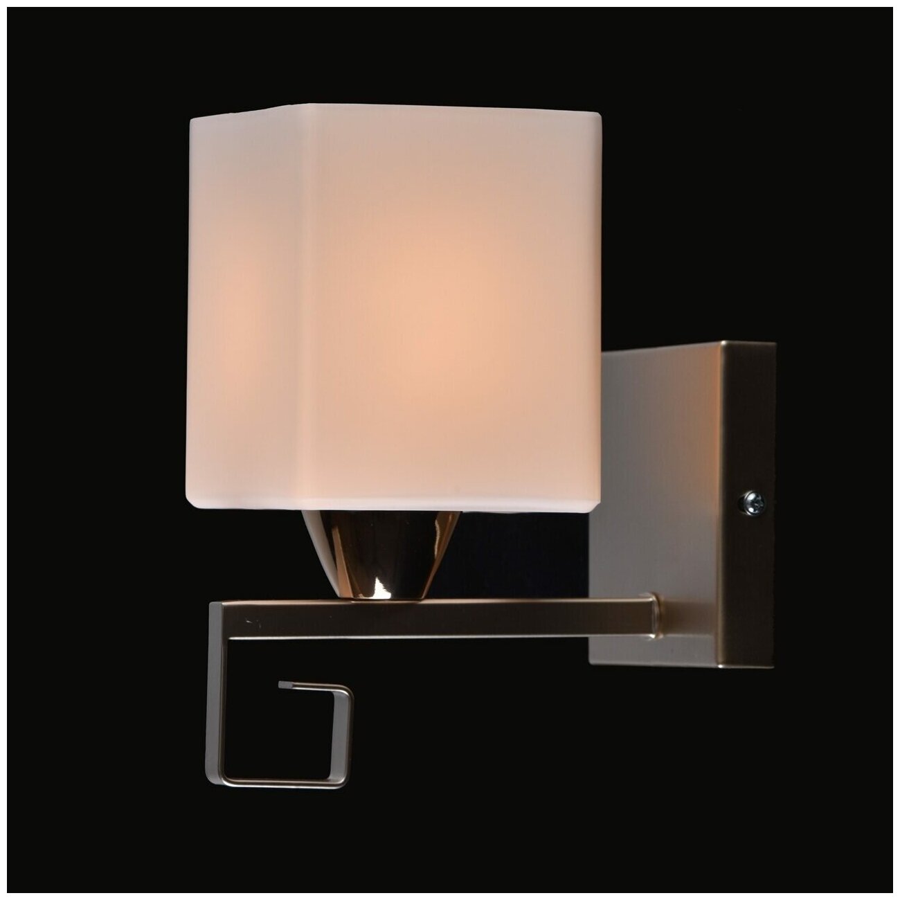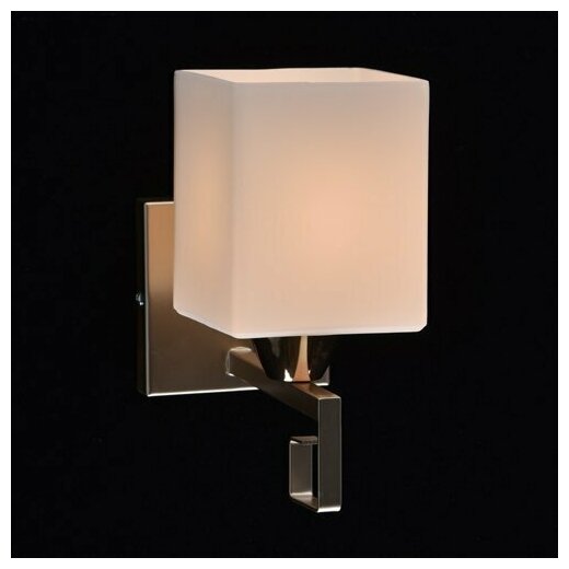Основание бра выполнено из металла. Корпус и рожок окрашены в цвет перламутрового золота. Держатель плафона гальванизирован в цвет золота. Плафон квадратной формы выполнен из стекла, окрашенного изнутри в белый цвет.