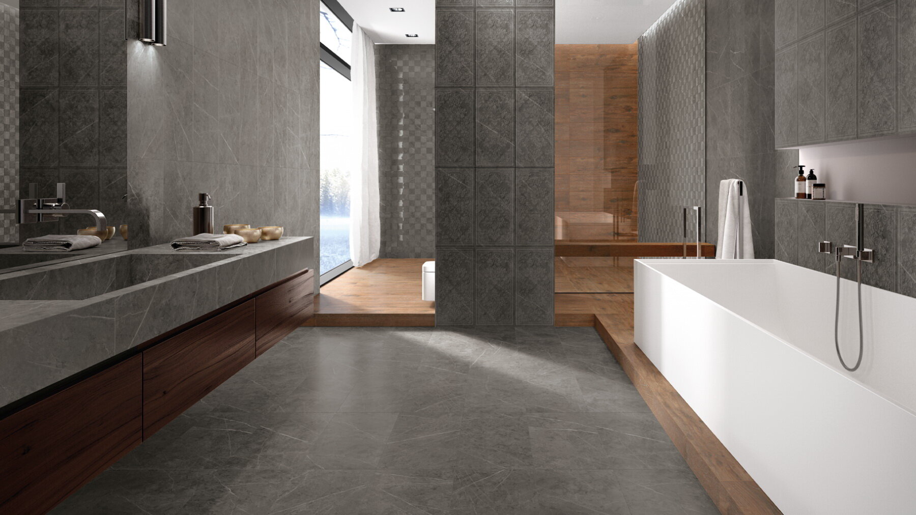 Покрытие хорошо гармонирует с ахроматической гаммой, естественными древесными и пастельными оттенками, камнем, металлическими и стеклянными элементами.