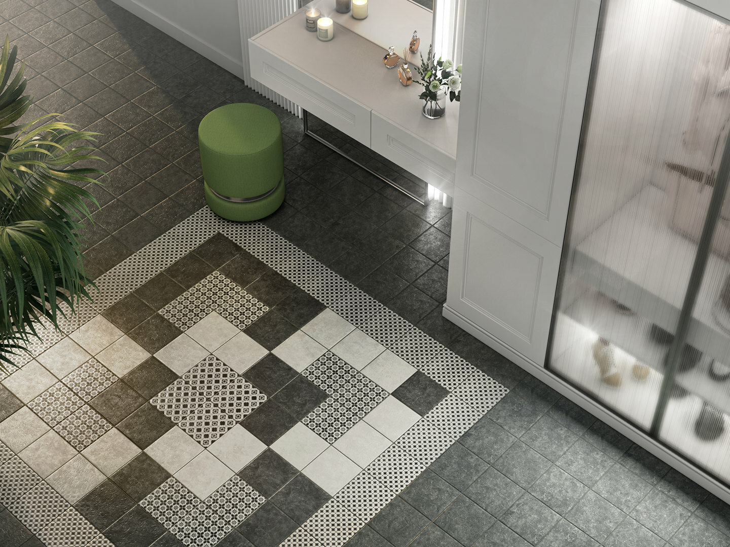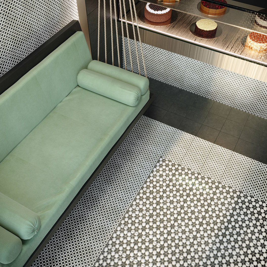 Сочетание черного и белого – безусловная классика, но в подобном исполнении и с такой графикой она выглядит очень современно. База и декоры выполнены в формате 20х20 см. Декоративные элементы решены методом цифровой печати: с её помощью точно воссоздан рисунок двухцветной мраморной инкрустации.