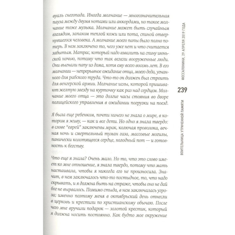 «Я была ещё ребёнком, почти ничего не знала о мире, в котором я живу, - как и все дети. Но одно я знала твёрдо: в слове «еврей» заключены мрак, колючая проволока, вечная ночь и смертельный туман газа, массовые могилы, панически колотящееся сердце, холодный пот - и готовность к бегству» -