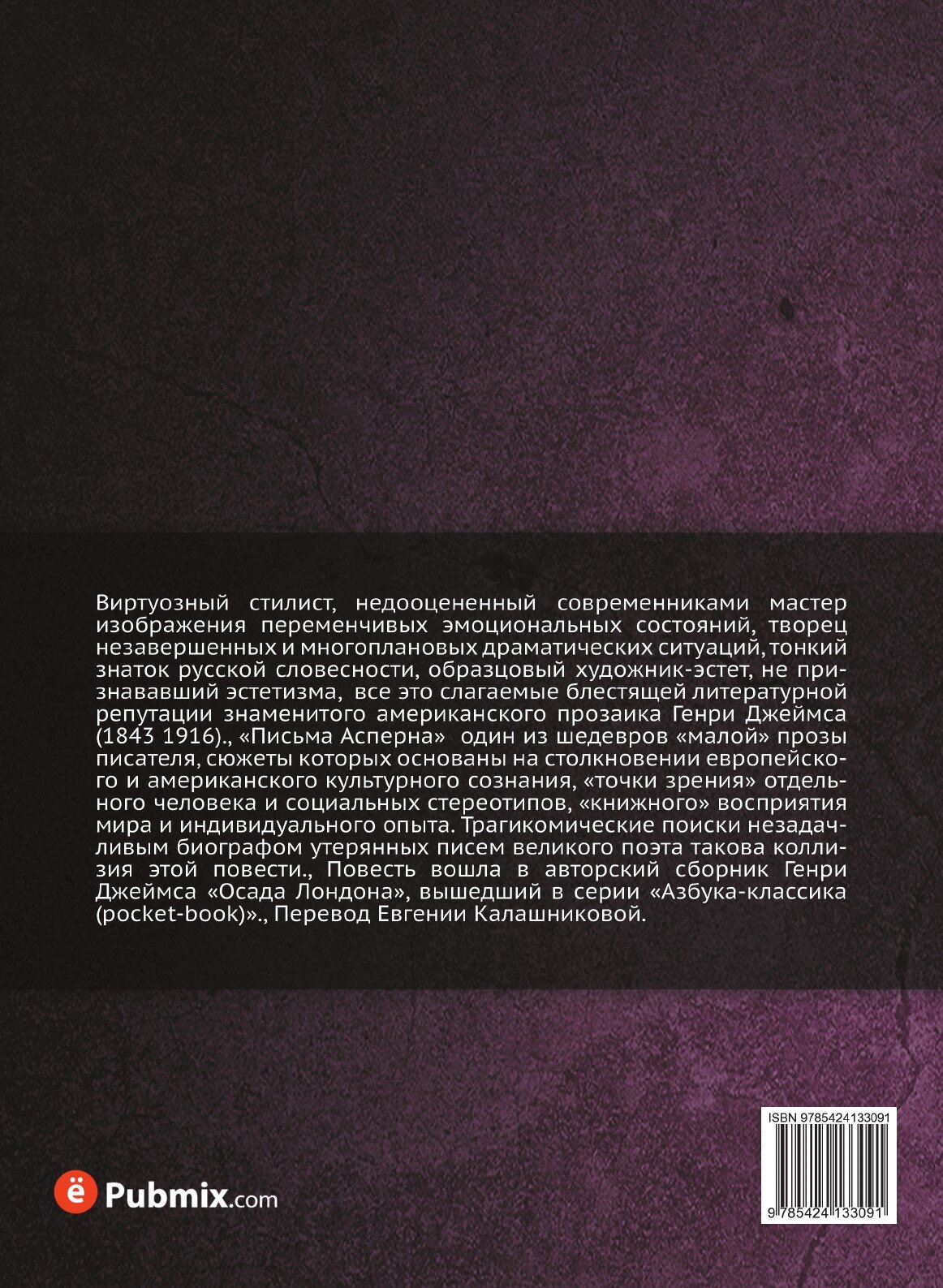 Виртуозный стилист, недооцененный современниками мастер изображения переменчивых эмоциональных состояний, творец незавершенных и многоплановых драматических ситуаций, тонкий знаток русской словесности, образцовый художник-эстет, не признававший эстетизма, все это слагаемые блестящей литературной репутации знаменитого американского прозаика Генри Джеймса (1843 1916)., «Письма Асперна» один из шедевров «малой» прозы писателя, сюжеты которых основаны на столкновении европейского и американского культурного сознания, «точки зрения» отдельного человека и социальных стереотипов, «книжного» восприятия мира и индивидуального опыта. Трагикомические поиски незадачливым биографом утерянных писем великого поэта такова коллизия этой повести., Повесть вошла в авторский сборник Генри Джеймса «Осада Лондона», вышедший в серии «Азбука-классика (pocket-book)»., Перевод Евгении Калашниковой.