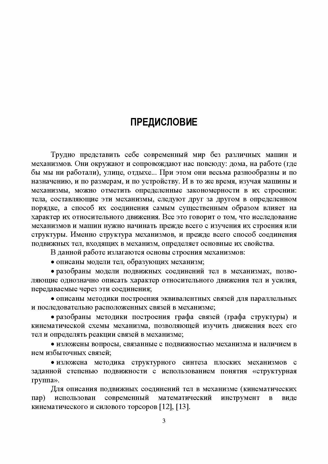 Изложены основы строения механизмов: описаны модели тел, образующих механизмы; разобраны модели подвижных соединений тел в механизмах, позволяющие описать однозначно характер относительного движения тел и усилия, передаваемые через эти соединения; приведены методики построения эквивалентных связей для параллельно и последовательно расположенных связей в механизме; разобраны методики построения графа связей (графа структуры) и кинематической схемы механизма, позволяющей изучить движения всех его тел и определять реакции связей в механизме; изложены вопросы, связанные со степенью подвижности механизма и наличием в нем избыточных связей; изложена методика структурного синтеза плоских механизмов с заданной степенью подвижности с использованием понятия "структурная группа".