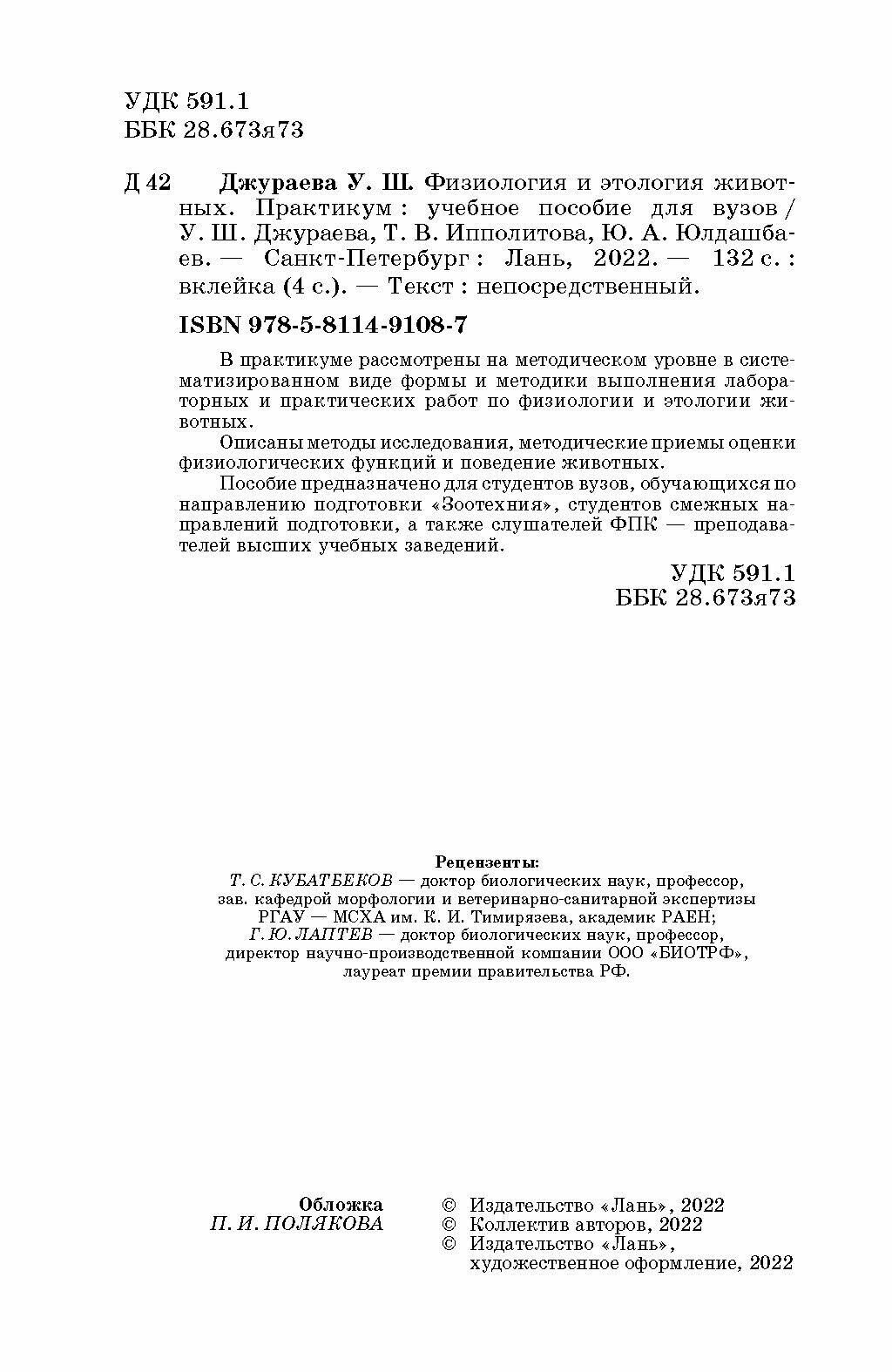 Физиология и этология животных Практикум Учебное пособие (Юлдашбаев Юсупжан Артыкович, Джураева Улугой Шаймардановна, Ипполитова Татьяна Владимировна); Лань, 2022