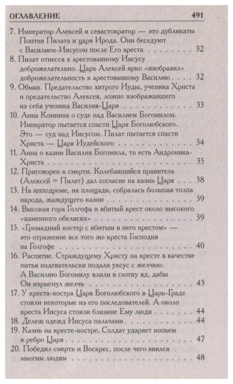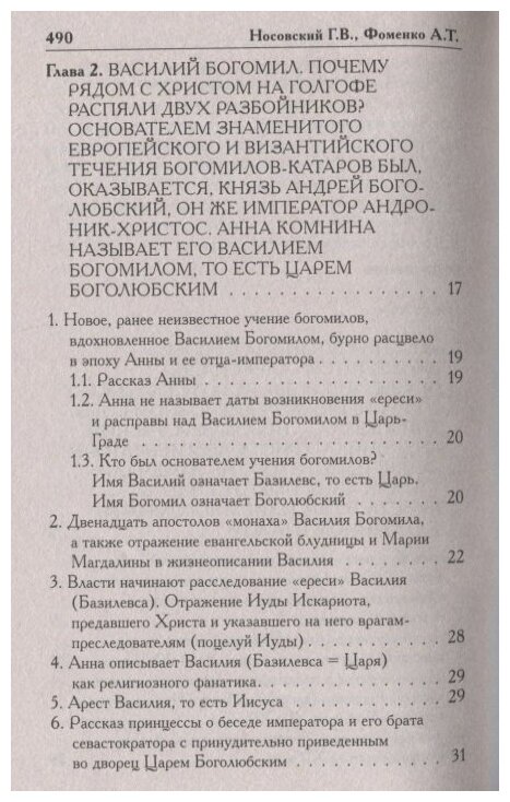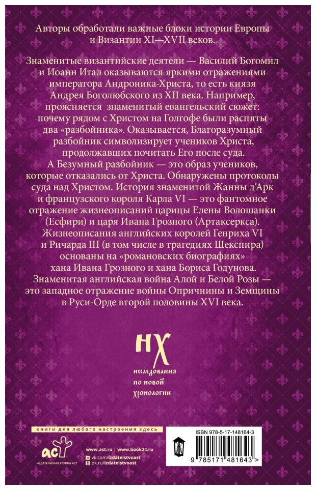Авторы обработали важные блоки истории Европы и Византии XI-XVII веков. Знаменитые византийские деятели - Василий Богомил и Иоанн Итал оказываются яркими отражениями императора Андроника-Христа, то есть князя Андрея Боголюбского из XII века. Например, проясняется знаменитый евангельский сюжет: почему рядом с Христом на Голгофе были распяты два "разбойника". Оказывается, Благоразумный разбойник символизирует учеников Христа, продолжавших почитать Его после суда. А Безумный разбойник - это образ учеников, которые отказались от Христа. Обнаружены протоколы суда над Христом. История знаменитой Жанны д'