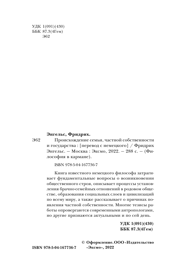 Происхождение семьи частной собственности и государства. (Энгельс Фридрих); ООО "Издательство "Эксмо", 2022