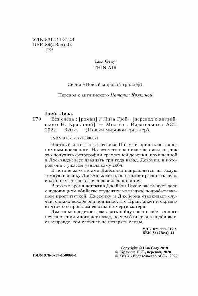 Книга: Без следа (Лиза Грей); ИЗДАТЕЛЬСТВО "АСТ", 2022