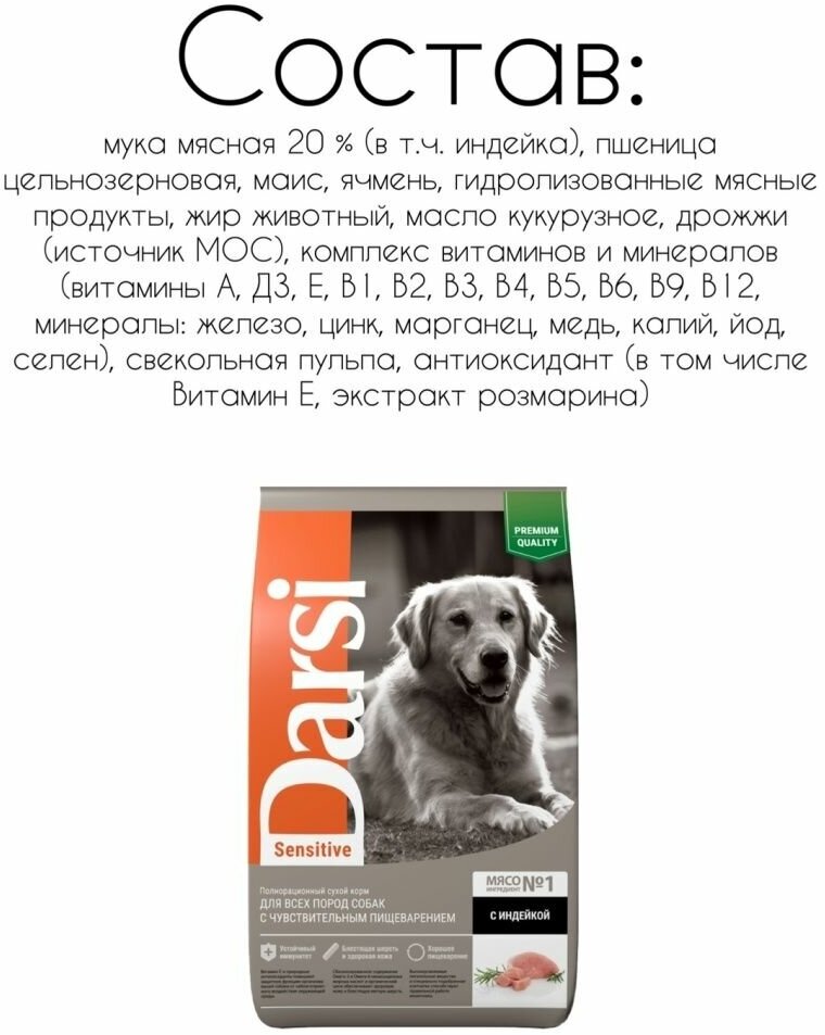 Сухой корм для собак всех пород DARSI Sensitive Индейка - это полнорационный корм Стандарт+ класса для собак с чувствительным пищеварением. Рецептура и показатели пищевой ценности корма разработаны согласно ГОСТ (Р 55453-2013). Корм производятся на заводе ООО Провими Пет Фуд Рус, который относится к крупному Холдингу Provimi Pet Food Голландия (производитель кормов для домашних животных на территории Западной и Восточной Европы, Азии и Южной Америки). витамин Е повышает защитные функции организма. Мясной протеин с полноценным аминокислотным составом - поддержка мышц. Кальций и фосфор в сбалансированном виде обеспечивают крепкие кости.