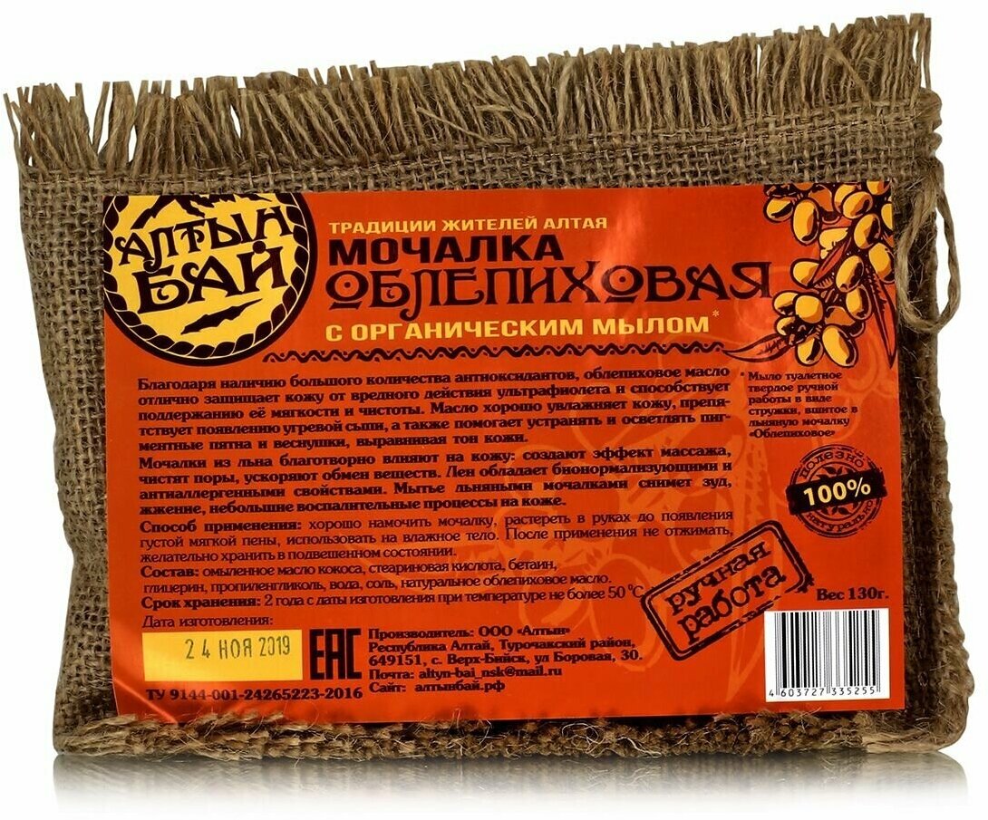 Натуральная мочалка проста и необычайно удобна в использовании: просто намочите её, и начните использовать без добавления каких-либо дополнительных средств для ухода за телом. Мочалка состоит из льняных волокон, которые механически очищают кожу, не повреждая её, органическое мыло нежно пенится, а его компоненты способствуют регенерации клеток кожи, замедляют процессы старения, создают эффект массажа, чистят поры, словом, помогают сохранить молодость, здоровье и красоту кожу. Специальный карман на мочалке позволяет удобно зафиксировать её на руке для идеального массажа всего тела. Благодаря наличию большого количества антиоксидантов, облепиховое масло отлично защищает кожу от вредного действия ультрафиолета и способствует поддержанию её мягкости и чистоты. Масло хорошо увлажняет кожу, препятствует появлению угревой сыпи, а также помогает устранять и осветлять пигментные пятна и веснушки, выравнивая тон кожи. Состав: органическая мыльная основа, облепиховое масло. Способ применения: хорошо намочить мочалку, растереть в руках до появления густой мягкой пены, использовать на влажное тело. После применения не отжимать, желательно хранить в подвешенном состоянии.