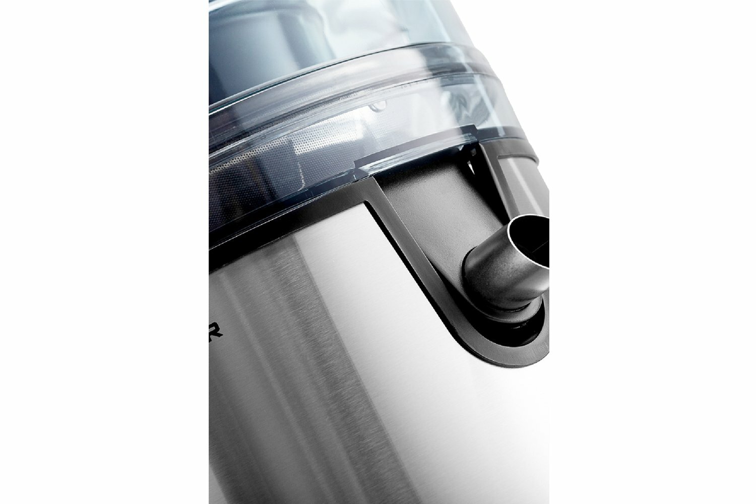Благодаря широкому загрузочному отверстию диаметром 85 мм можно не разрезать предварительно яблоки, груши и прочие продукты на части, а класть их целиком в соковыжималку.