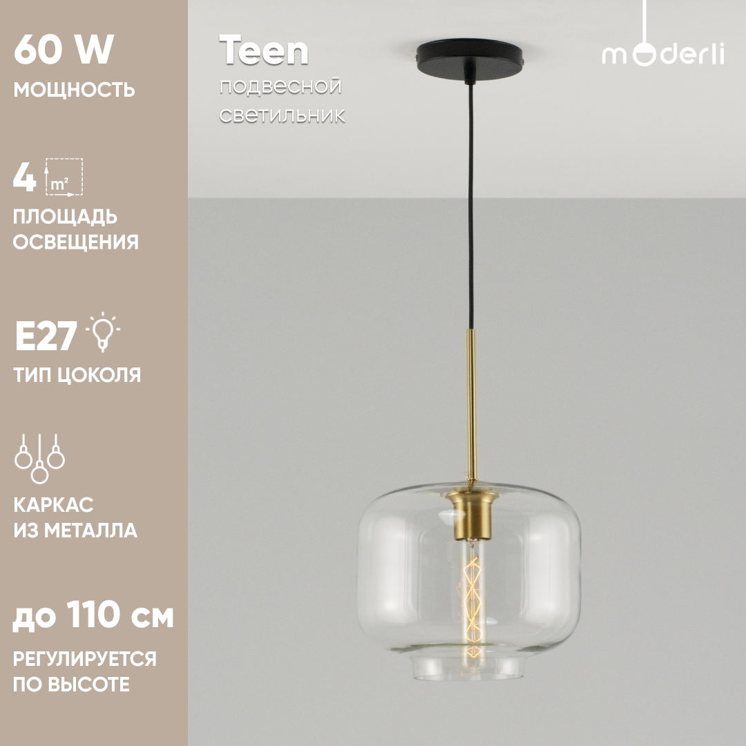 Подвесной светильник в современном стиле с плафоном из прозрачного стекла. Светильник Teen прекрасно смотрится как в комплекте из нескольких штук, так и в единичном экземпляре, впишется во множество интерьеров и станет стильным дополнением любого помещения. Отлично подойдет для освещения обеденной зоны, кухни, зала, гостиной. Площадь освещения 4 кв. м. При монтаже светильник можно отрегулировать по высоте.