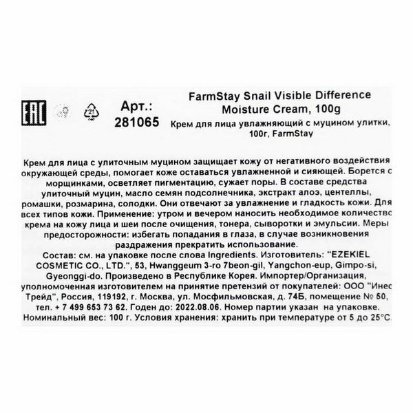 | Состав | Water, Mineral Oil, Butylene Glycol, Glycerin, Isopropyl Myristate, Cetearyl Alcohol, Glyceryl, Stearate, PEG-100 Stearate, Cyclopentasiloxane, Cyclohexasiloxane, Sodium Hyaluronate, Urea, Polysorbate 60, Sorbitan Stearate, Dimethicone, Carbomer, Triethanolamine, Phenoxyethanol, Methylparaben, Betaine, Panax Ginseng Callus Culture Extract, Snail Secretion Filtrate, Fragrance, Disodium EDTA, Propylparaben, Tocopheryl Acetate, Ubiquinone, Camellia Sinensis Leaf Extract, Centella Asiatica Extract, Glycyrrhiza Glabra (Licorice) Root Extract, Chamomilla Recutita (Matricaria) Flower Extract, Polygonum Cuspidatum Root Extract, Rosmarinus Officinalis (Rosemary) Leaf Extract, Scutellaria Baicalensis Root Extract, Olea Europaea (Olive) Fruit Extract, Hydrolyzed Placental Extract, Adenosine |
