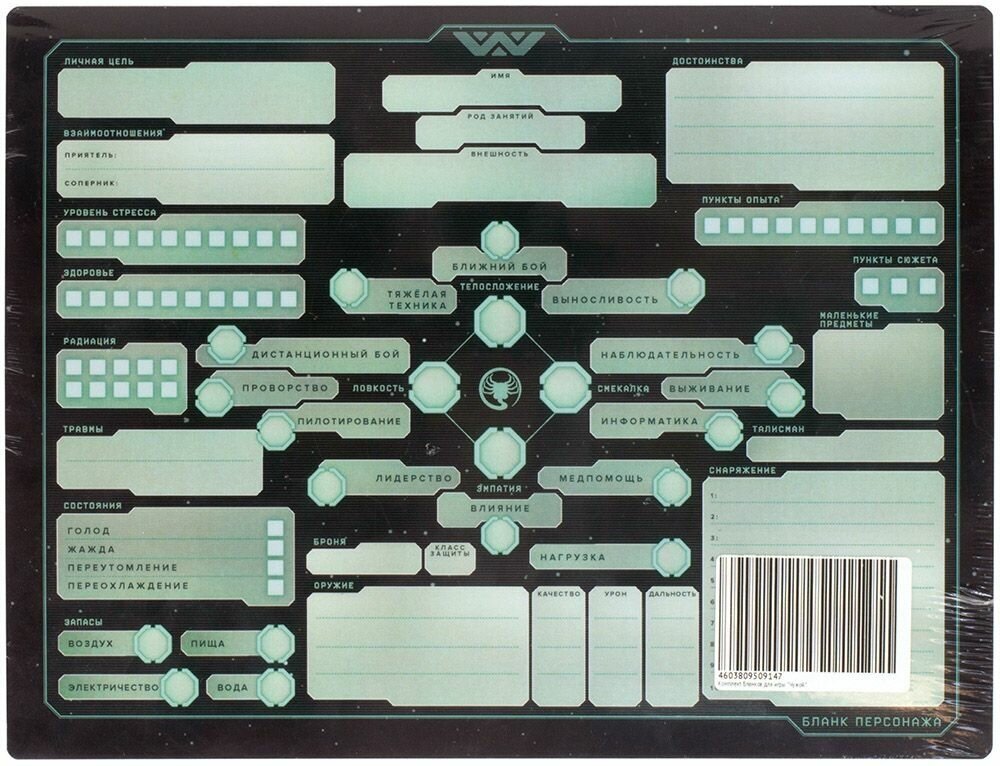 Театр начинается с вешалки, а ролевая игра - с создания персонажа. Именно он будет сражаться с монстрами, договариваться с всякими встречными-поперечными и изучать окружающую среду. От того, как вы раскидаете очки, сколько из них придется на удачу, а сколько на силу, будет зависеть не только исход ваших действий, но и ваша стратегия. Если харизма не вкачана, даже не пытайтесь кого-то обаять - лучше полагаться на то, что является вашей сильной стороной. Эти прекрасные и нарядные бланки для настольной ролевой игры "Чужой". Здесь вы впишите все свои показатели. Ну а самое главное - они многоразовые. То есть верхний слой легко стирается и создается новый персонаж, еще краше предыдущего. На них можно делать записи карандашом и стирать их обычным ластиком на протяжении очень долгого времени. Идеально, не придется мучать себя допечаткой таких важных для игры материалов.