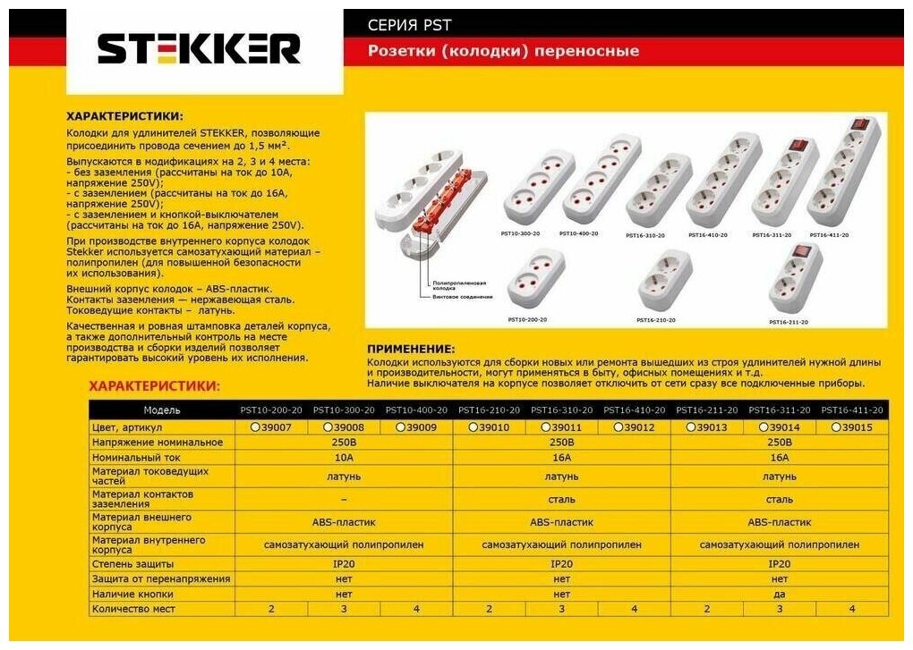Розетка STEKKER PST10-300-20 (разборная) на 3 гнездо, без заземления. Материал: полипропилен, латунь, цвет белый, размер 161*58*30мм. Номинальное напряжение 250В, номинальный ток 10А, диапазон рабочих температур 0..+40°C, IP20