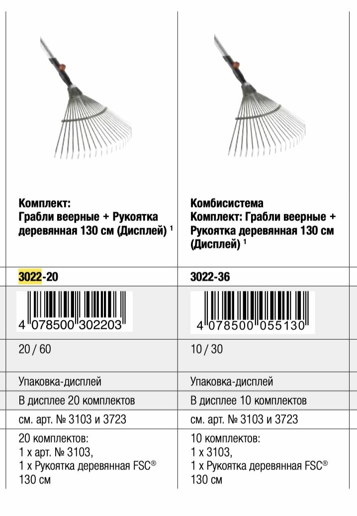 | Прочие особенности и свойства | Gardena 3022-20 - веерные грабли для сбора листьев, скошенной травы и прочих садовых отходов. Гибкие оцинкованные зубья изготовлены из пружинной стали. Грабли могут использоваться с любой ручкой Gardena Combisystem. |