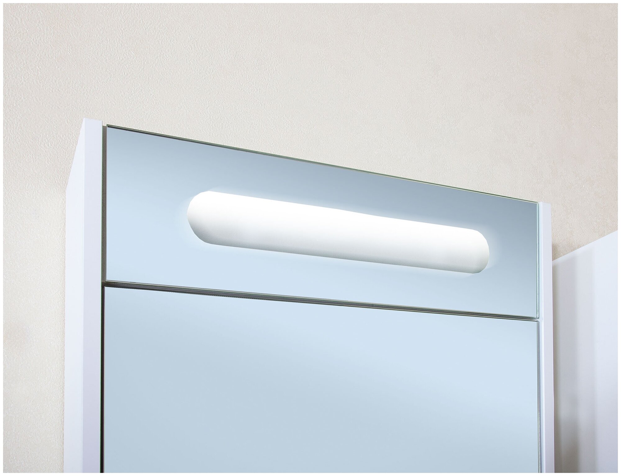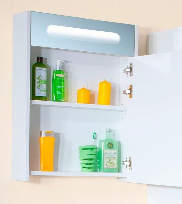 Зеркало выполнено в виде подвесного зеркального шкафчика, внутри которого за распашной дверцей расположено вместительное отделение с горизонтальной полкой, где можно разместить парфюмерные и косметические средства. Очень эффектно выполнена подсветка зеркала. Сверху установлен светильник 6 вт, свет которого проходит сквозь овальное прозрачное окошко.