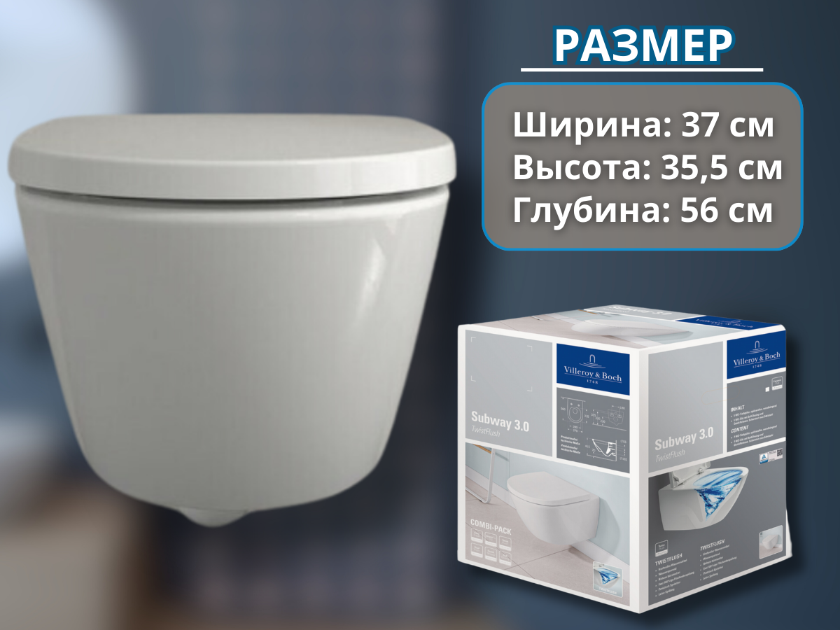 Array форма унитаза Villeroy & Boch Subway 3.0 длиной 56 см, шириной 37 см, высотой 36 см, позволяет гармонично установить унитаз. Villeroy & Boch Subway 3.0 4670TSR1 выполнен в современном стиле, что позволит создать уютную атмосферу данного направления дизайна. Наличие функции микролифта на крышке унитаза Villeroy & Boch 4670TSR1 обеспечит максимальную плавность и бесшумность закрывания. Унитаз Subway 3.0 4670TSR1 является безободковым, что не только очень гигиенично и легко в уборке, но и очень стильно. Горизонтальный (в стену) выпуск унитаза Villeroy & Boch Subway 3.0 4670TSR1 обеспечит отличную проходимость, но этот параметр обязательно нужно учесть при монтаже.