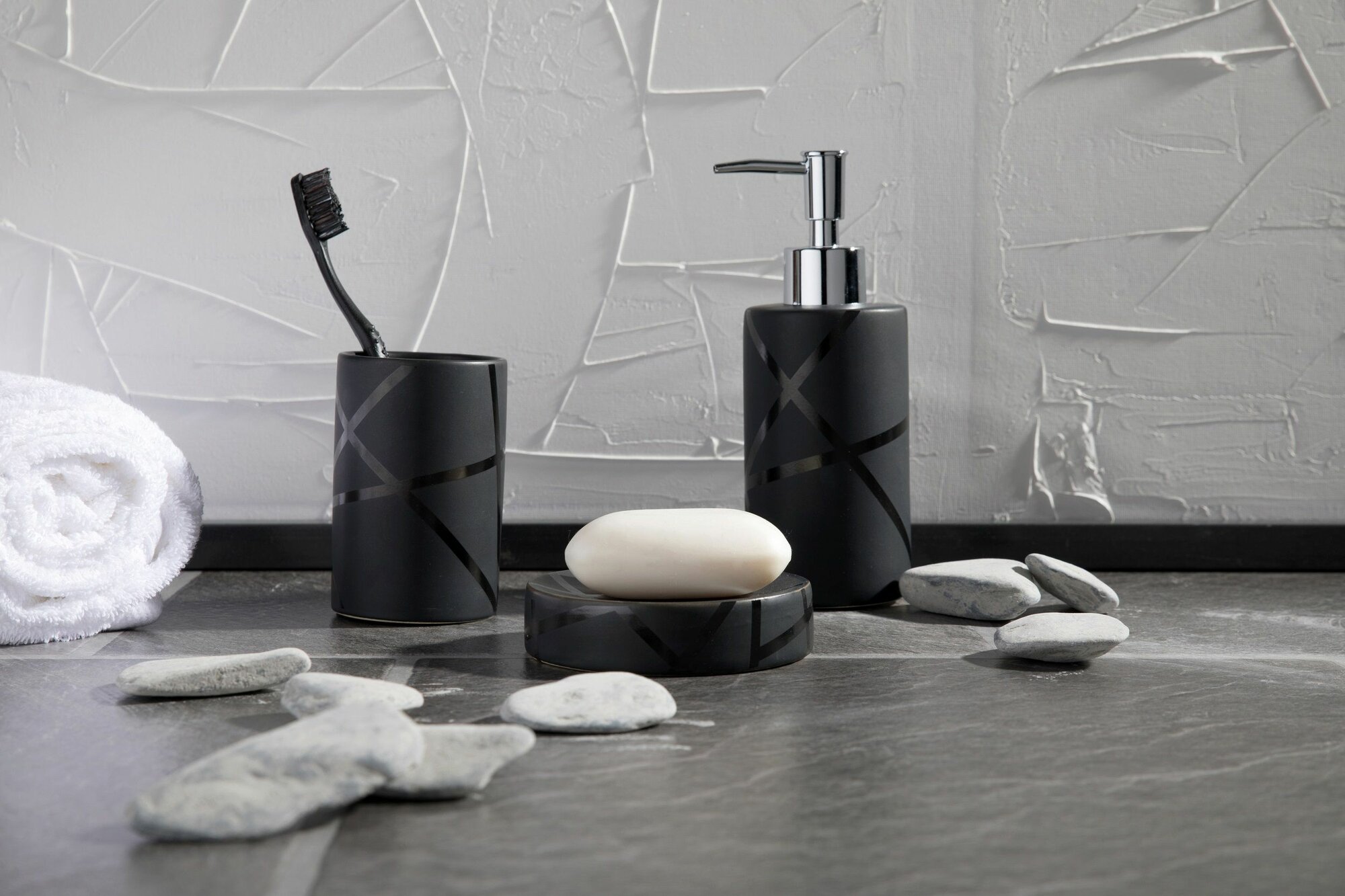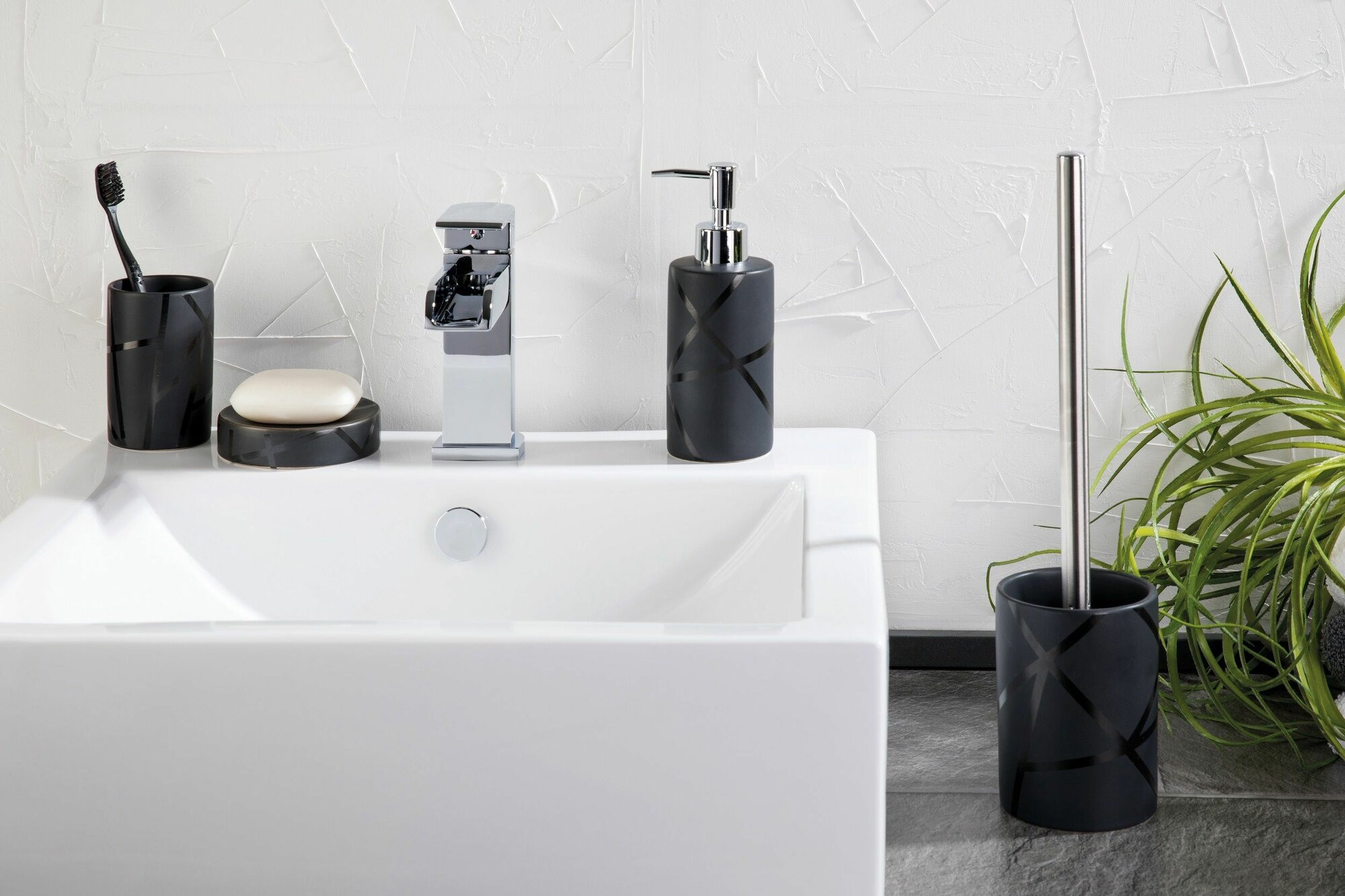 Дозатор AXENTIA Nero для жидкого мыла из черной матовой керамики с отделкой ввиде глянцевых линий. В матовом черном цвете с глянцевыми линиями - стильно и декоративно, создавая современный вид в ванной комнате.Из фаянса, хромированный насос, цвет: черный - в элегантном круглом дизайне - практично и удобно.Идеально подходит для размещения на краю умывальника в ванной, гостевом туалете, умывальнике или кухне - идеально сочетается с другими предметами из серии AXENTIA Nero.Размер Ø 6,5 см. высота 18 см. объем 300 мл.