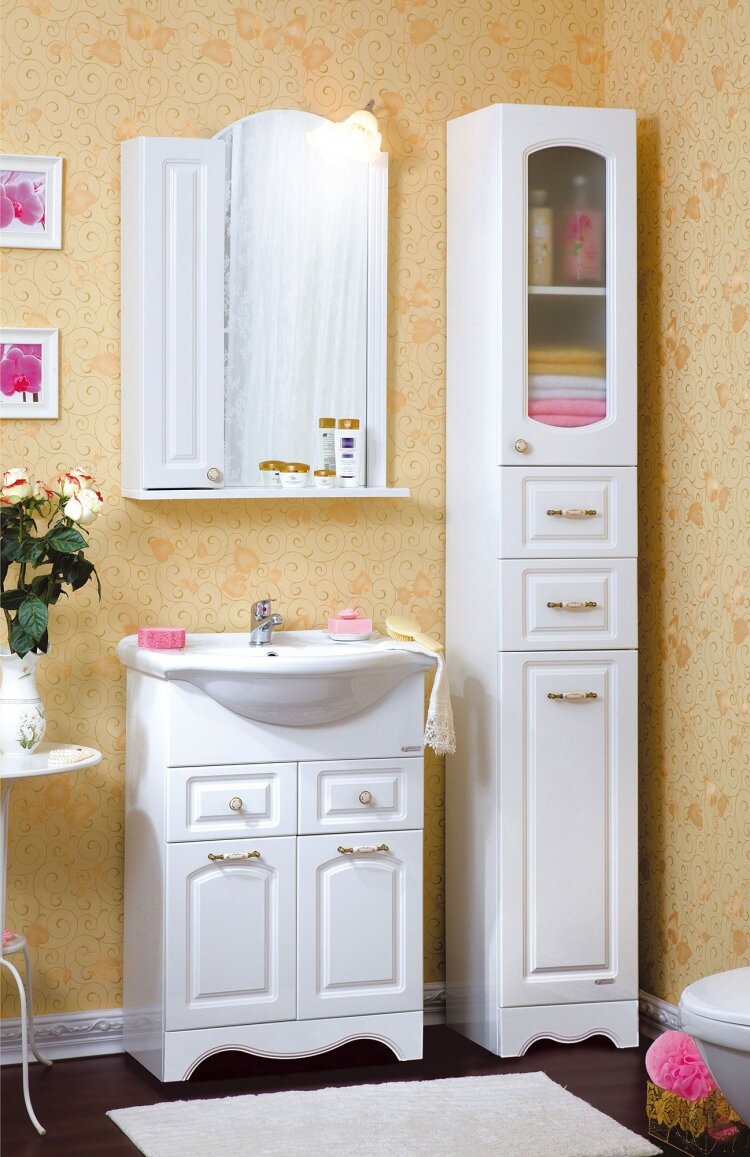 Элегантная тумба «Анна» (белый глянец) — прекрасный образец неоклассического стиля: белоснежный фасад с изящной фрезеровкой, золотисто-фарфоровые ручки полу на дверках и выдвижных ящичках тумбы — все это наделено дарить помещение благородный вид, который пребывает в гармонии с общим интерьером ванной комнаты. Ширина модели 60 см — она не оставляет много места, но при этом спрячет от внешних глаз все необходимые предметы обихода: косметические и гигиенические средства, белье, халаты. «Анна» (белый глянец) создатель благоухающего весеннего утра в будущем доме.