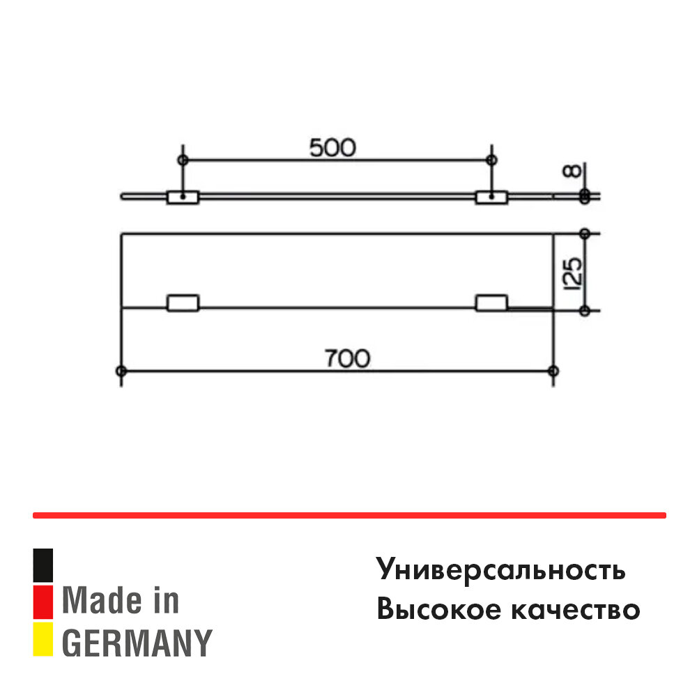 Полка 70 см Keuco Edition 11 11110 015700 Характеристики: Габариты (ШхГхВ): 70x12,5x2 см Материал: закаленное безопасное стекло (TSG)/металл Цвет: прозрачный/ хром Монтаж: настенный Фактура: глянцевая Гарантия: 5 лет Германия Комплект поставки: Полка Кронштейны для полки Набор креплений Инструкция Изделия этой серии подкупают своей визуальной легкостью, стильными формами и бескомпромиссным качеством. Инновационная функциональность повышает удобство использования и создает ощущение роскоши. Серия EDITION 11 задает высокие стандарты оснащения ванной комнаты, неподвластные времени.