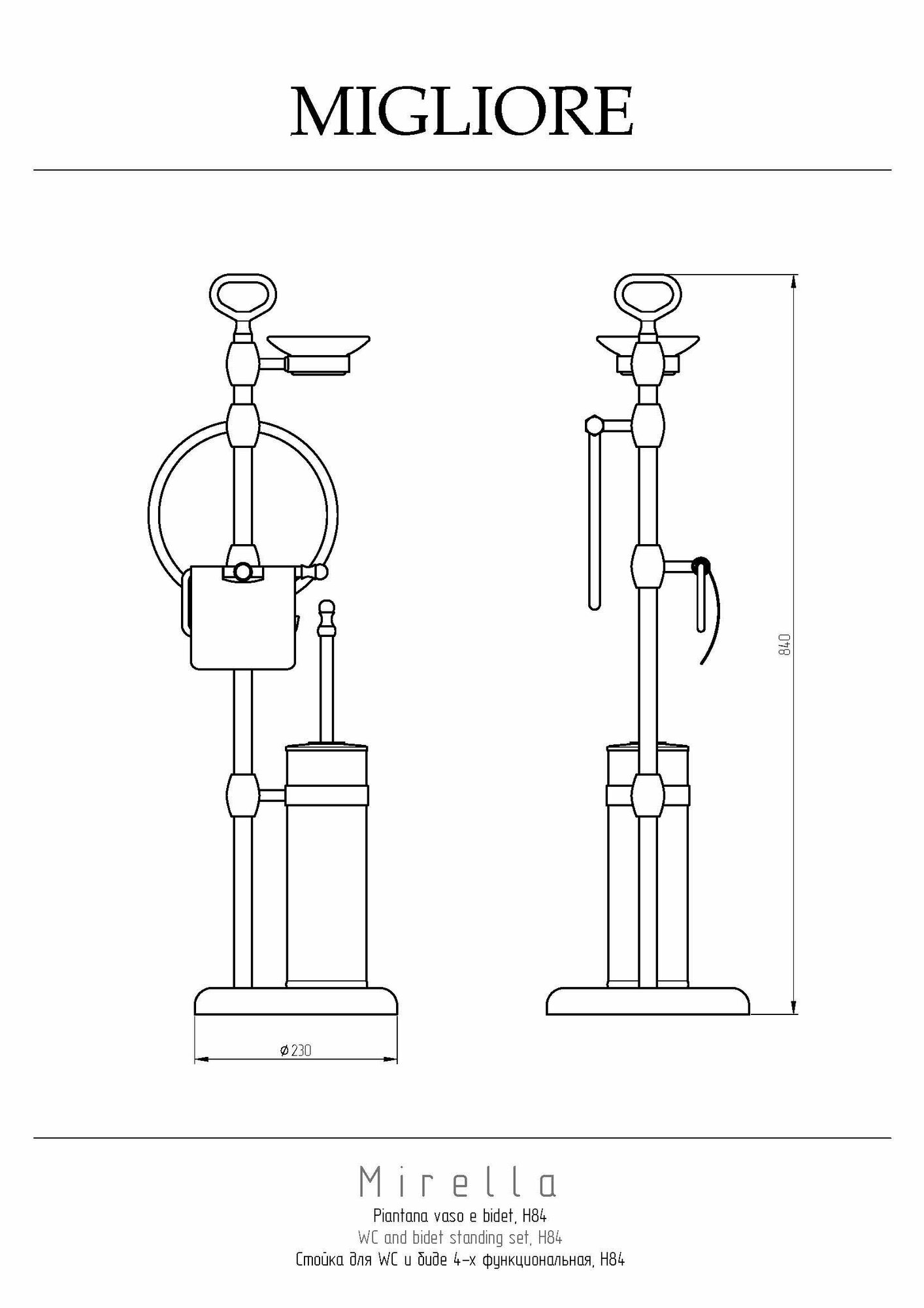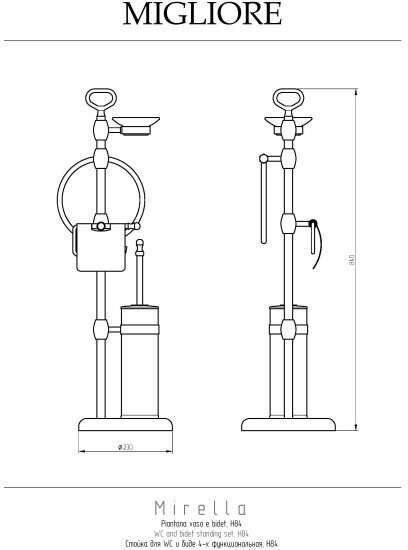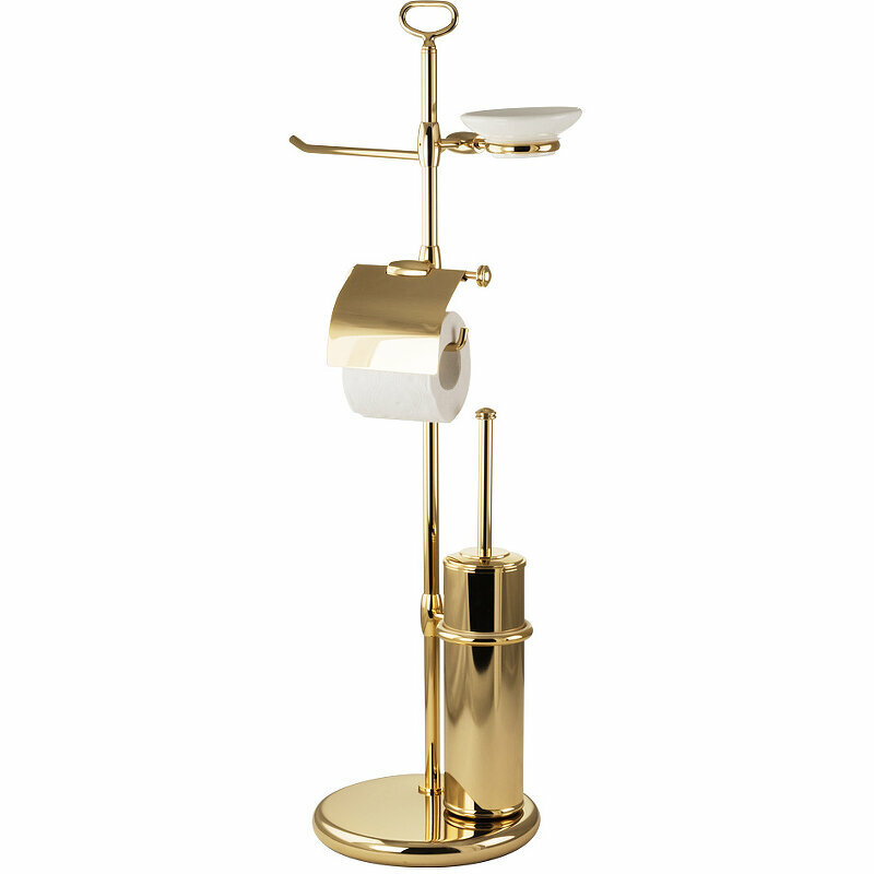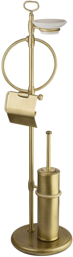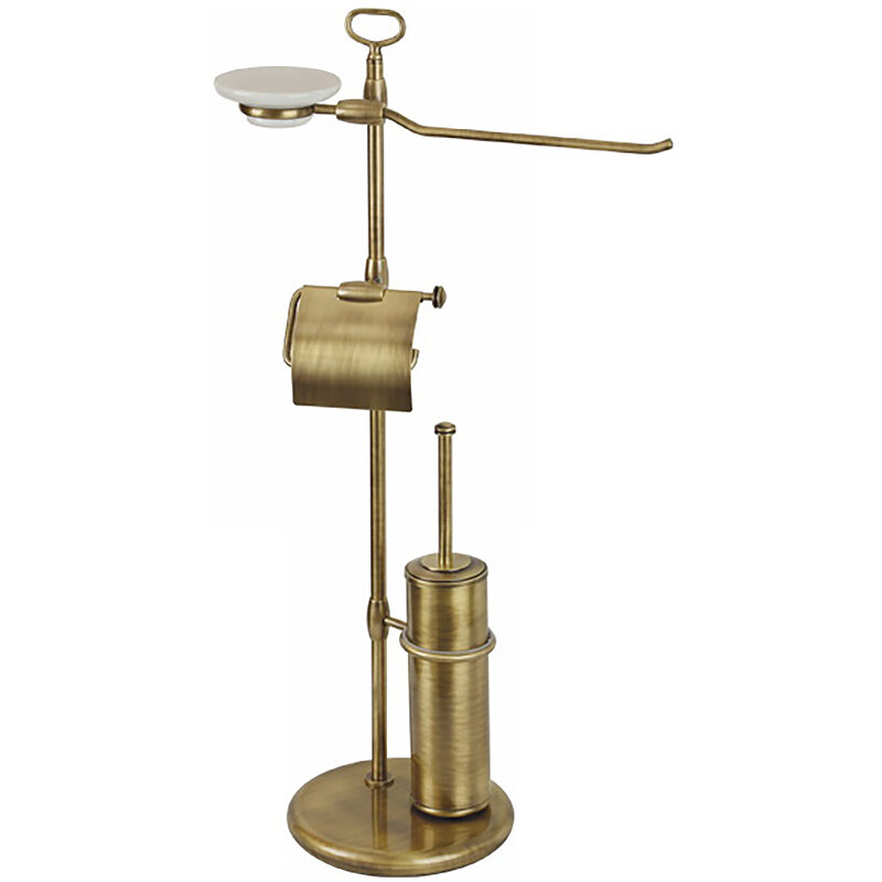 MIRELLA Стойка h84 см. 4-х функциональная, бронза Стойка для унитаза и биде серии MERELLA бренда MIGLIORE - это функциональный аксессуар для ванной комнаты. В верхней части расположен держатель для мыльницы и полотенцедержатель, далее — бумагодержатель с крышкой и латунный ерш, внутри которого вставлена пластиковая колба, которую легко мыть. Вы можете выбрать для комплектации любую мыльницу — керамическую, мыльницу из матового стекла с декором или прозрачного стекла. Материал — латунь, покрытие цвета бронза. Внимание: бронзовое покрытие достаточно деликатное и для ухода рекомендуется протирать изделие мягкой безворсовой тряпочкой с мыльным раствором и вытирать насухо или использовать чистящее средство бренда MIGLIORE для смесителей и аксессуаров с деликатными покрытиями бронза, золото, медь. Внимание: бронзовое покрытие достаточно деликатное и для ухода рекомендуется протирать изделие мягкой безворсовой тряпочкой с мыльным раствором и вытирать насухо или использовать чистящее средство бренда MIGLIORE для смесителей и аксессуаров с деликатными покрытиями бронза, золото, медь. Материал: Латунь; Оснащение: крепления (шурупы)
