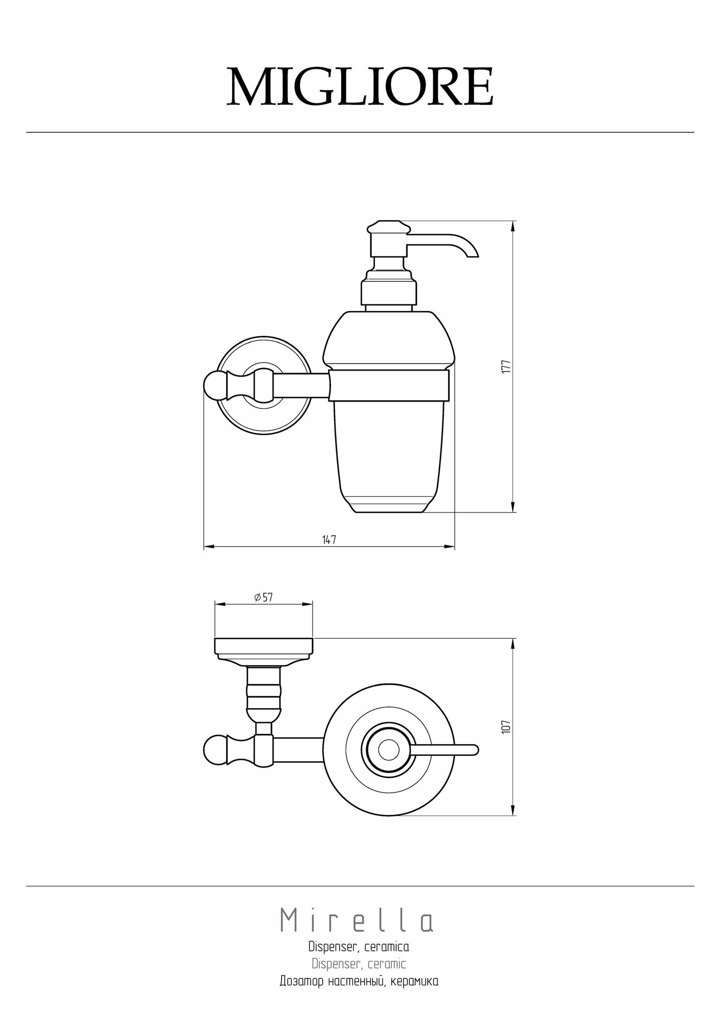 MIRELLA Дозатор жидкого мыла настенный, керамика/бронза Дозатор настенный серии MIRELLA брэнда MIGLIORE — это незаменимый аксессуар в ванной комнате. Дозатор выполнен из высококачественной керамики, материал держателя — латунь, покрытие цвета бронза. Внимание: бронзовое покрытие достаточно деликатное и для ухода рекомендуется протирать изделие мягкой безворсовой тряпочкой с мыльным раствором и вытирать насухо или использовать чистящее средство Migliore для смесителей и аксессуаров с деликатным покрытием бронза, золото, медь. Внимание: бронзовое покрытие достаточно деликатное и для ухода рекомендуется протирать изделие мягкой безворсовой тряпочкой с мыльным раствором и вытирать насухо или использовать чистящее средство бренда MIGLIORE для смесителей и аксессуаров с деликатными покрытиями бронза, золото, медь. Материал: Латунь+керамика; Оснащение: крепления (шурупы)