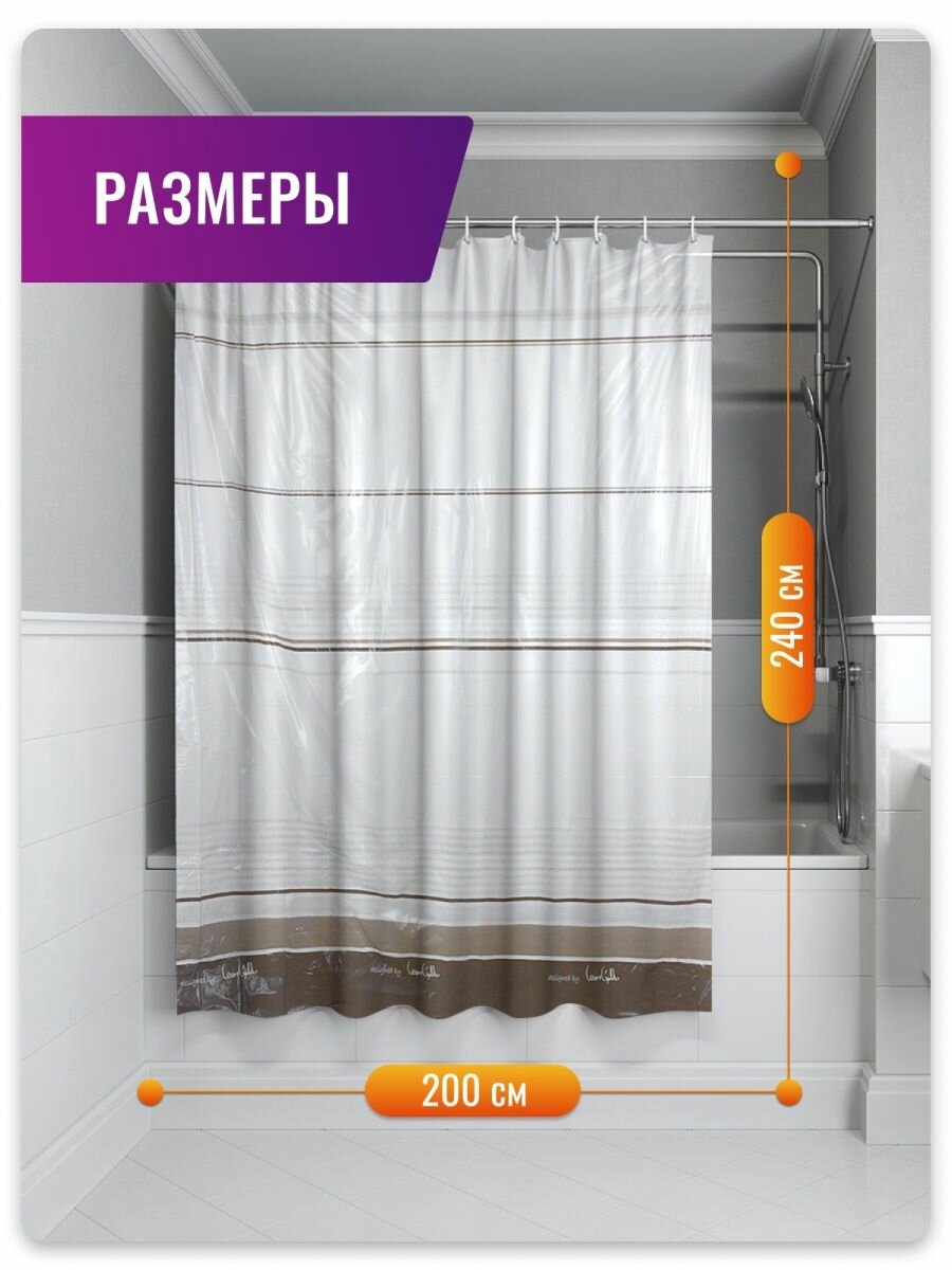 Шторы для ванной и душа изготовлены из полиэстера с тефлоновой пропиткой. Размер шторок для ванной и душа 180*200 см. Шторы Bacchetta выделяются привлекательным внешним видом, ярким, красочным дизайном. Материал ценится за свою устойчивость ко всевозможным воздействиям моющих веществ, влагостойкость и бактерицидность. Высокая устойчивость к влажности - на поверхности и в швах не образуется плесень. Производитель - Bacchetta, Италия. Уважаемые покупатели, в данной карточке товаров размеры штор 180 на 200 см. Также у нас в линейке есть шторы шириной 200 см и длинной 240 см, чтобы ознакомится с полным ассортиментом продукции нажмите на значок бренда Стар Экспо.