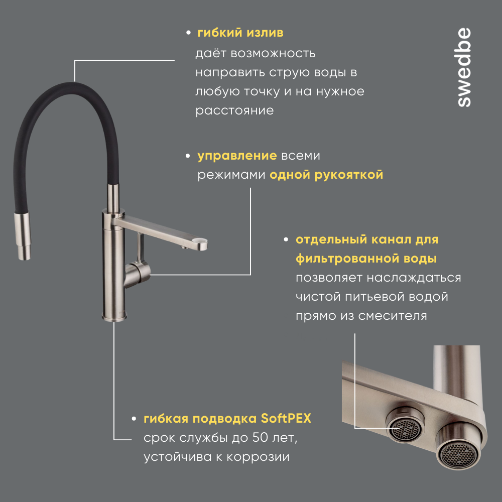 Смеситель Swedbe для кухонной мойки нержавеющая сталь/черный Selene Plus 8640