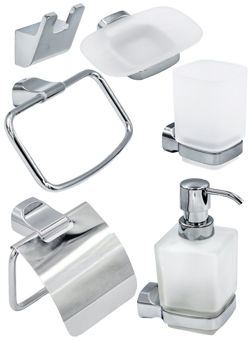 | Состав набора | стакан, мыльница, держатель для туалетной бумаги, полотенцедержатель, крючок |