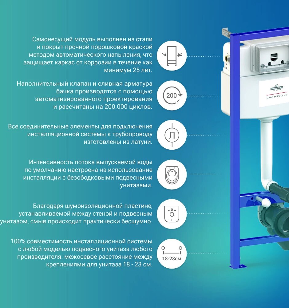 Инсталляция для унитаза Lavinia Boho Relfix 77020024. Единое инсталляционное решение для монтажа в любую типовую сантехническую шахту вне зависимости от расположения стояков, водопроводных труб и других инженерных коммуникаций. Инсталляционная система Lavinia Boho Relfix оснащена универсальным комплектом креплений, что позволяет производить не только стандартный прямой монтаж рамы к стене, но и в случае неровности стен осуществлять поворотный монтаж, вплоть до установки инсталляции в угол помещения. Бачок скрытого монтажа, корпус которого изготовлен из долговечного полимерного материала HDPE, является цельнолитым (бесшовным). Наливной и сливной механизмы сертифицированы как I класс по французскому стандарту NF, обеспечивают бесперебойную работу смыва и самый низкий уровень шума в своем классе - 8.5 Db. Все пластмассовые компоненты бачка изготавливаются посредством литья под давлением и прессом, что позволяет получать сложные, функциональные и долговечные элементы. Все соединительные элементы для подключения инсталляционной системы к трубопроводу изготовлены из латуни. Звукоизоляционная пластина для подвесной керамики позволит существенно снизить шум воды, сливаемой из бачка инсталляционной системы. Дополнительно, пластина станет амортизирующей прослойкой между керамикой и плиткой, защищая поверхности от повреждения. Шумоизоляция оснащена необходимыми универсальными монтажными отверстиями для легкой установки любой подвесной керамики. Ультратонкий монтаж клавиши смыва обеспечивает высокую эстетику, а также облегчает поддержание чистоты в туалете. Панель смыва минимально выступает за поверхность кафеля и относится к одним из самых тонких решений на рынке. Панель смыва впечатляет не только стильным дизайном, но и интегрированным антибактериальным покрытием SanitiZed, благодаря которому ограничивается рост и размножение бактерий на 99%. Ионы серебра не теряют свою активность даже после многих лет использования. Устойчивое покрытие панели смыва не смывается и не стирается со временем. Комплектация: система инсталляции; комплект крепления для скрытого подвесного монтажа; шумоизоляция для подвесной керамики; клавиша смыва (цвет черный, материал стекло); инструкция по монтажу и эксплуатации; гарантийный талон