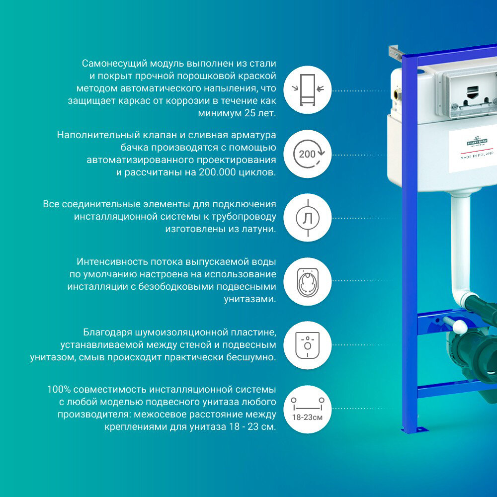 Совершенно случайно узнали, на одном форуме, что есть инсталляции с угловым монтажом. Остановили свой выбор на этой. По параметрам всё устроило. Примечательно еще то, что ее можно приобрести отдельно (унитаз не входит в комплект). Пока с чашей не определились, но подойдёт любая т.к. есть два варианта межосевых креплений 18см и 23см. Поэтому она абсолютна универсальная. За “пару копеек” дополнительно купили дозатор для дез. средств.Достоинства:
