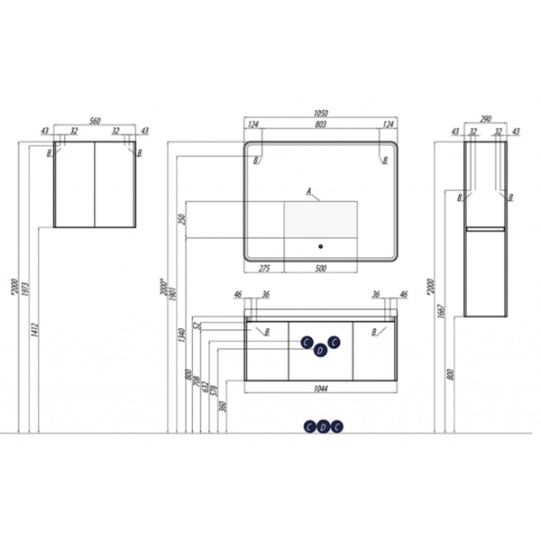 | Оснащение | зеркало с антизапотевателем, зеркало с подсветкой, крепления, механизм доводчика, организация пространства, сенсорный выключатель |