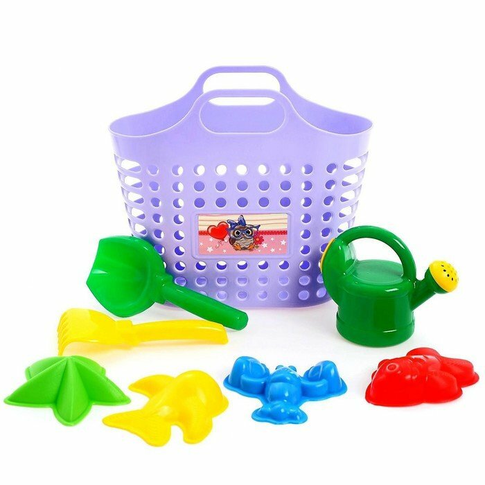 В этом наборе 8 предметов: сумка-корзина, лейка (мини),совок 16 см, грабли 15 см, формочки для песка 4 шт.
