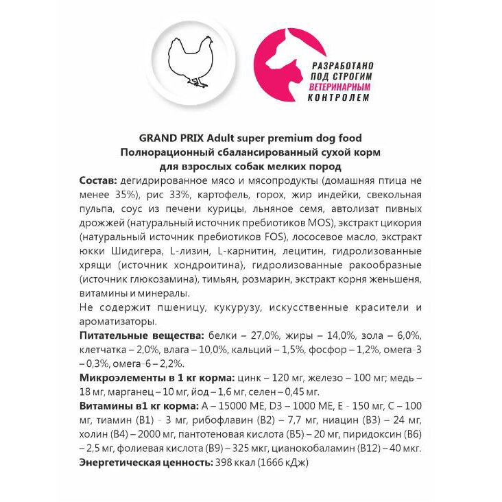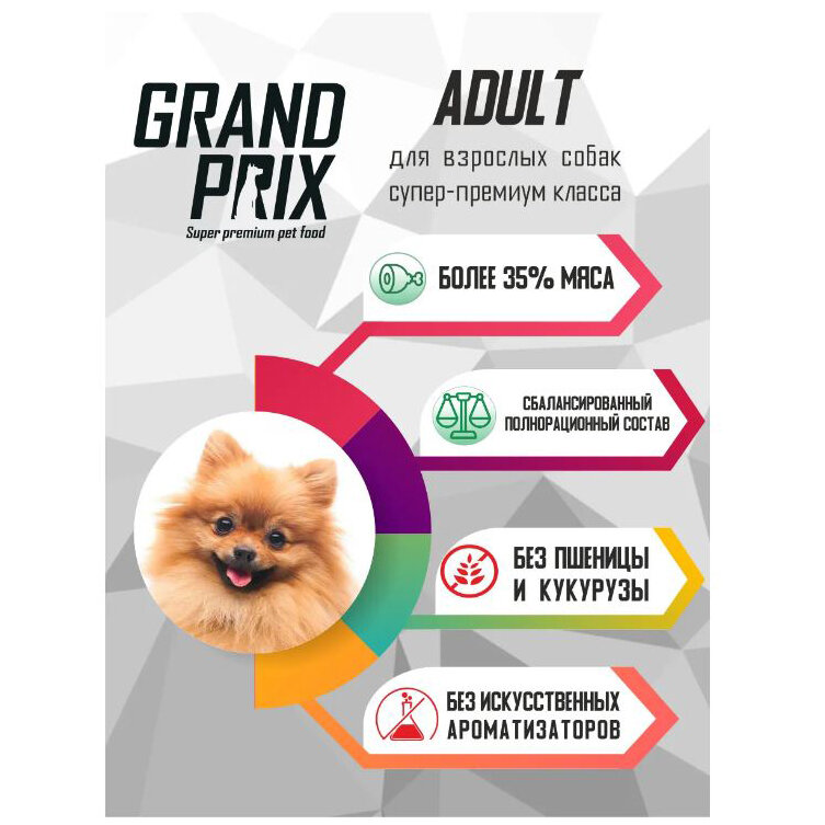 Корм GRAND PRIX Adult для взрослых собак мелких и мини пород разработан с учетом суточных потребностей небольших собак в полноценном наборе микроэлементов и витаминов. Сбалансированный корм обеспечит питомцу заботу о пищеварительном тракте, предотвращая накопление токсинов в организме. Корм гипоаллергенен. Благодаря наличию витамина E, витаминов группы B и таурина, потребление корма снижает риск развития патологий нервной системы и сердечной недостаточности, повышает иммунитет. Кальций укрепляет кости и зубы, а наличие витаминов H и B7, незаменимых аминокислот Омега-3 и Омега-6 способствует здоровью сосудистой системы, обновлению клеток эпителия и поддержанию здоровья шерсти и подшерстка. Корм разработан на основе суточных потребностей собак в оптимальном наборе микроэлементов и витаминов. Корм богат клетчаткой из овощей и высококачественным белком благодаря повышенному содержанию мяса.