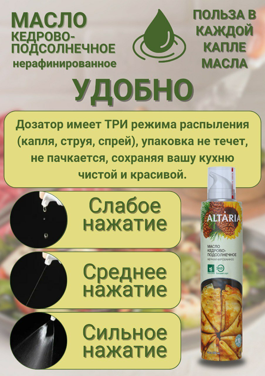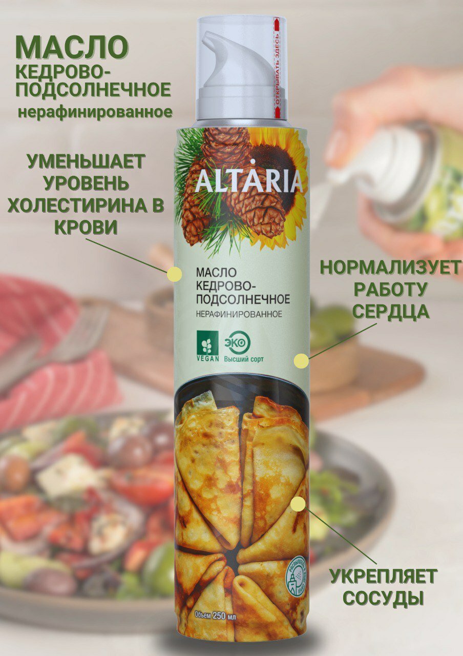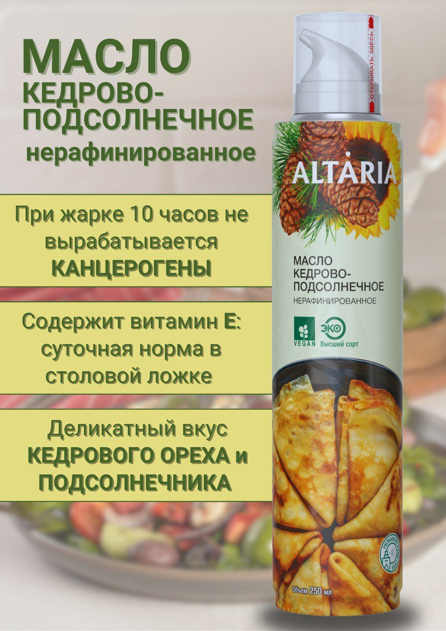 Масло кедрово-подсолнечное нерафинированное высшего сорта объемом 250 мл представляет собой уникальное сочетание двух растительных масел - кедрового и подсолнечного.Масло кедрового ореха, входящее в состав, является источником полезных витаминов и микроэлементов. Оно обладает легким ореховым вкусом, который прекрасно дополняет вкус ваших блюд, придавая им неповторимый аромат и энергию.Подсолнечное масло, в свою очередь, обеспечивает насыщенный вкус и аромат, делая блюда более сытными и питательными.Технология производства масла Altaria включает в себя метод холодного прессования, что позволяет сохранить все полезные свойства натуральных масел в первозданном виде. Вакуумная упаковка масла исключает контакт с воздухом, предотвращая окисление и потерю полезных свойств.Удобный дозатор с тремя режимами распыления (капля, струя, спрей) позволяет экономично расходовать масло. Баллон 250 мл хватит на 2-2,5 месяца постоянного использования.Масло Алтария напрямую с завода Алтайского края, что гарантирует высокое качество продукта. Товар сертифицирован.Масло кедрово-подсолнечное нерафинированное высшего сорта станет полезным подарком для мамы, бабушки, свекрови или других близких людей. Оно также подойдет для спортсменов, детского питания и здорового образа жизни.