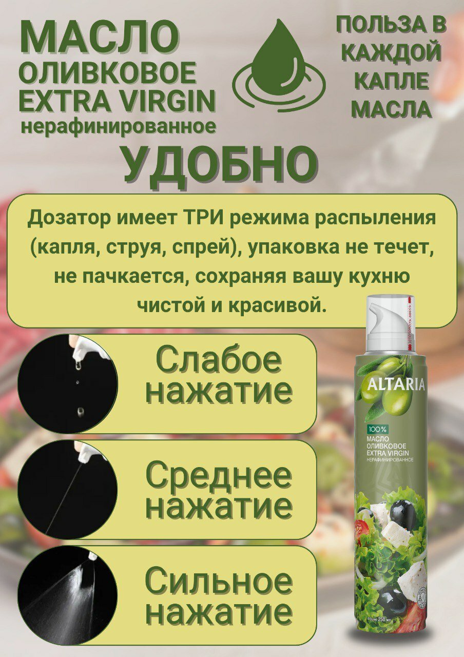 Масло оливковое EXTRA VIRGIN нерафинированное в\с от ALTARIA - это экологически чистый продукт из фермерского сырья, который производится на заводе Алтайского края.Масло холодного отжима 100% Extra Virgin обладает насыщенным мягким вкусом без горчинки, что делает его идеальным для приготовления салатных приправ.Удобная вакуумная упаковка исключает контакт масла с воздухом, предотвращая процесс окисления и потери полезных свойств.Удобный дозатор с тремя режимами распыления (капля, струя, спрей) позволяет точечно распылять масло, экономя его расход. Баллона 250 мл. хватит на 2-2,5 месяца постоянного использования.Оливковое масло с распылителем напрямую с завода Алтайского края, что гарантирует высокое качество продукта. Товар сертифицирован.Масло оливковое EXTRA VIRGIN нерафинированное в\с от ALTARIA станет полезным и практичным подарком для здорового образа жизни.