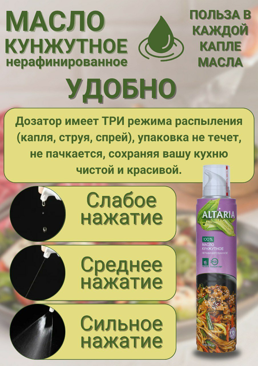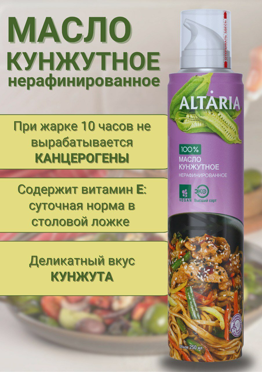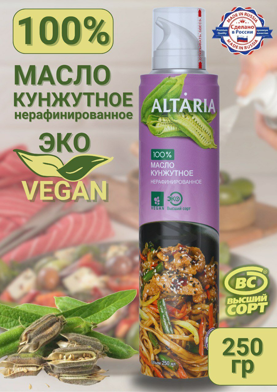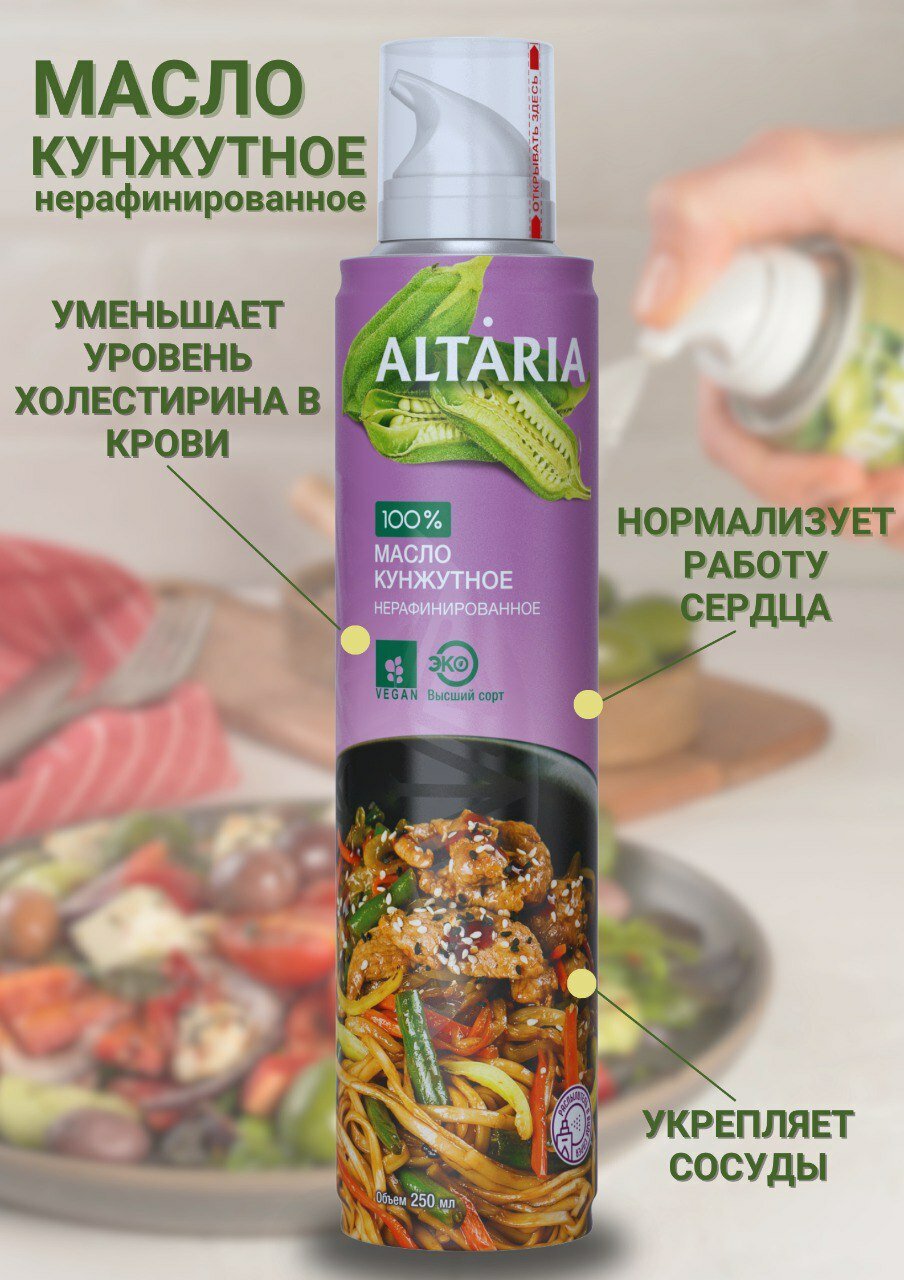 Кунжутное масло "Высший сорт" от Altaria - это 100% нерафинированное растительное масло, изготовленное методом холодного прессования из отборных семян белого кунжута. Благодаря этому процессу, масло сохраняет все полезные свойства и уникальный вкус.Масло богато полиненасыщенными жирными кислотами, витаминами и минералами, такими как кальций, железо и магний. Оно также является отличным источником антиоксидантов, которые помогают поддерживать здоровье организма.Удобная форма спрея позволяет легко дозировать масло и равномерно распределять его по поверхности пищи. Это делает его удобным и эффективным в использовании, позволяя наслаждаться всеми преимуществами кунжутного масла без излишнего расхода.Откройте для себя богатый и утонченный вкус этого нерафинированного масла, добавляя его в заправки для салатов, приготовление вкусных соусов или приправу для азиатских блюд. С его помощью ваши кулинарные творения приобретут особый шарм и пользу для здоровья.