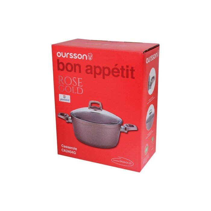 Кастрюля с крышкой Oursson Кастрюля серии Rose Gold изготовлена из качественного алюминия с антипригарным 3-х слойным покрытием GIZEM FRIT. Антипригарное покрытие как с внутренней, так и с внешней стороны обеспечивает легкий уход, пища не пригорает, и кастрюля легко моется. Ручки выполнены из термостойкого бакелита с мягким покрытием Soft touch, они очень приятные и мягкие на ощупь. Крышка кастрюли изготовлена из прочного стекла фирмы Pyrex. Посуда серии Rose Gold подходит для всех типов плит, кроме индукционных. Ее можно мыть в посудомоечной машине.