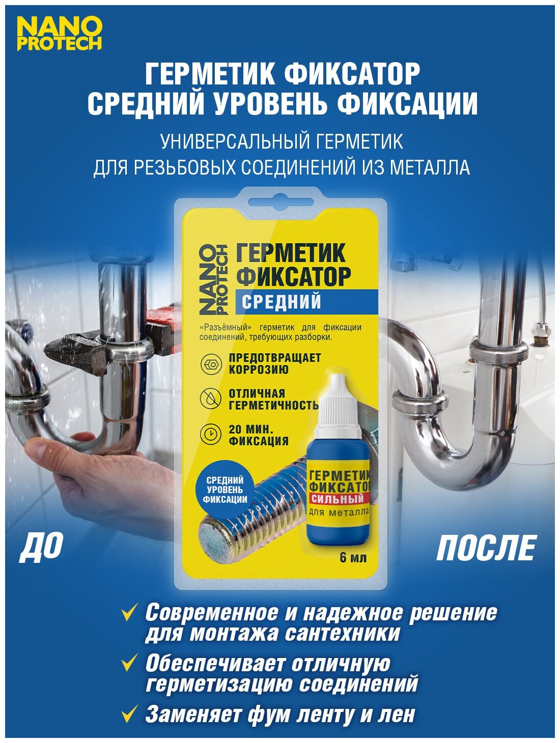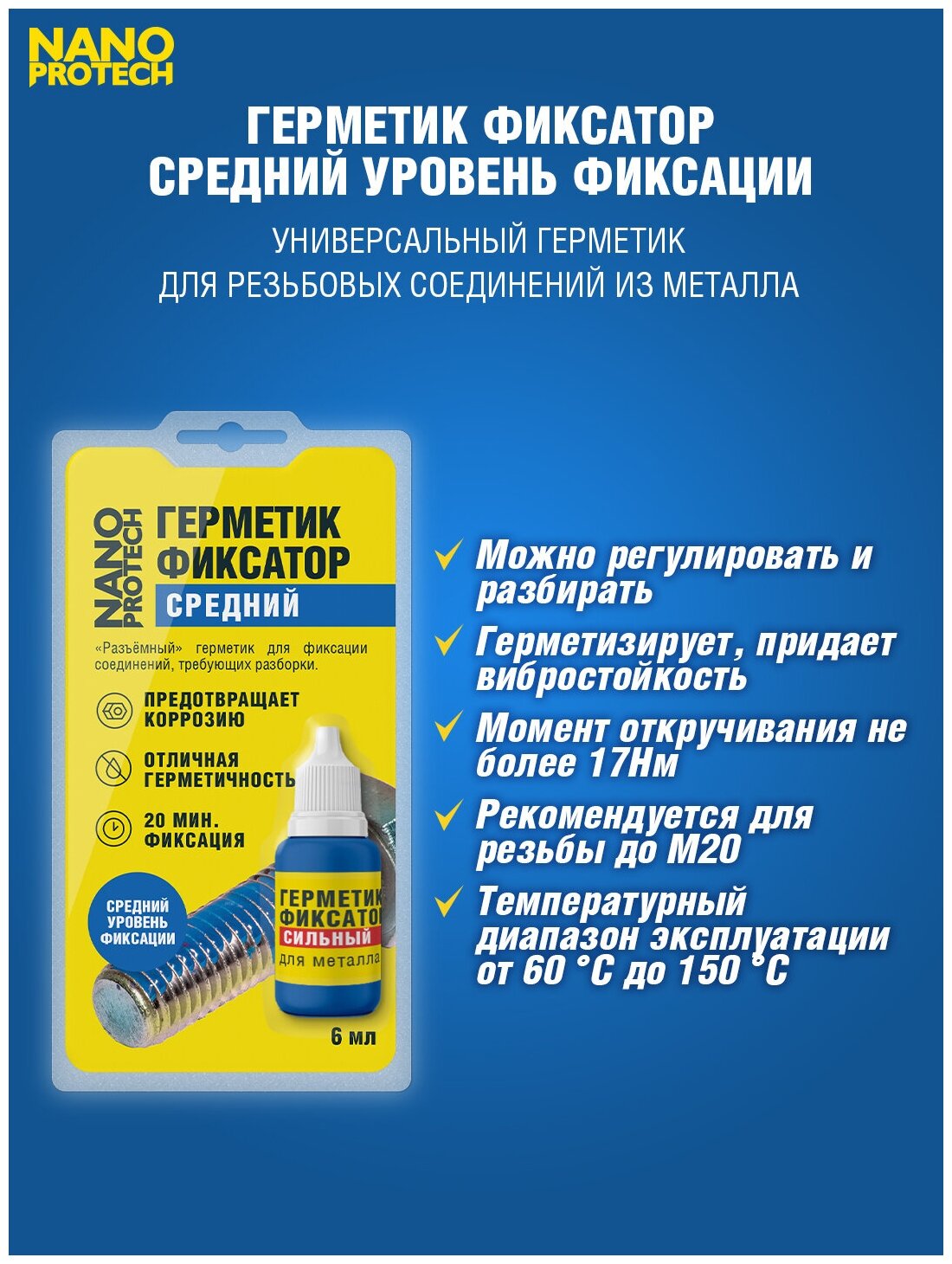 Универсальный герметик для резьбовых соединений из металла, средний уровень фиксации. «Разъёмный» для соединений, требующих регулировки и разборки. Герметизирует и придаёт вибростойкость. Рекомендуется для резьбы до М20. Момент откручивания не более 17 Н м. Идеальное решение для сантехники, ремонта автомобилей, электроприборов, спортинвентаря.
